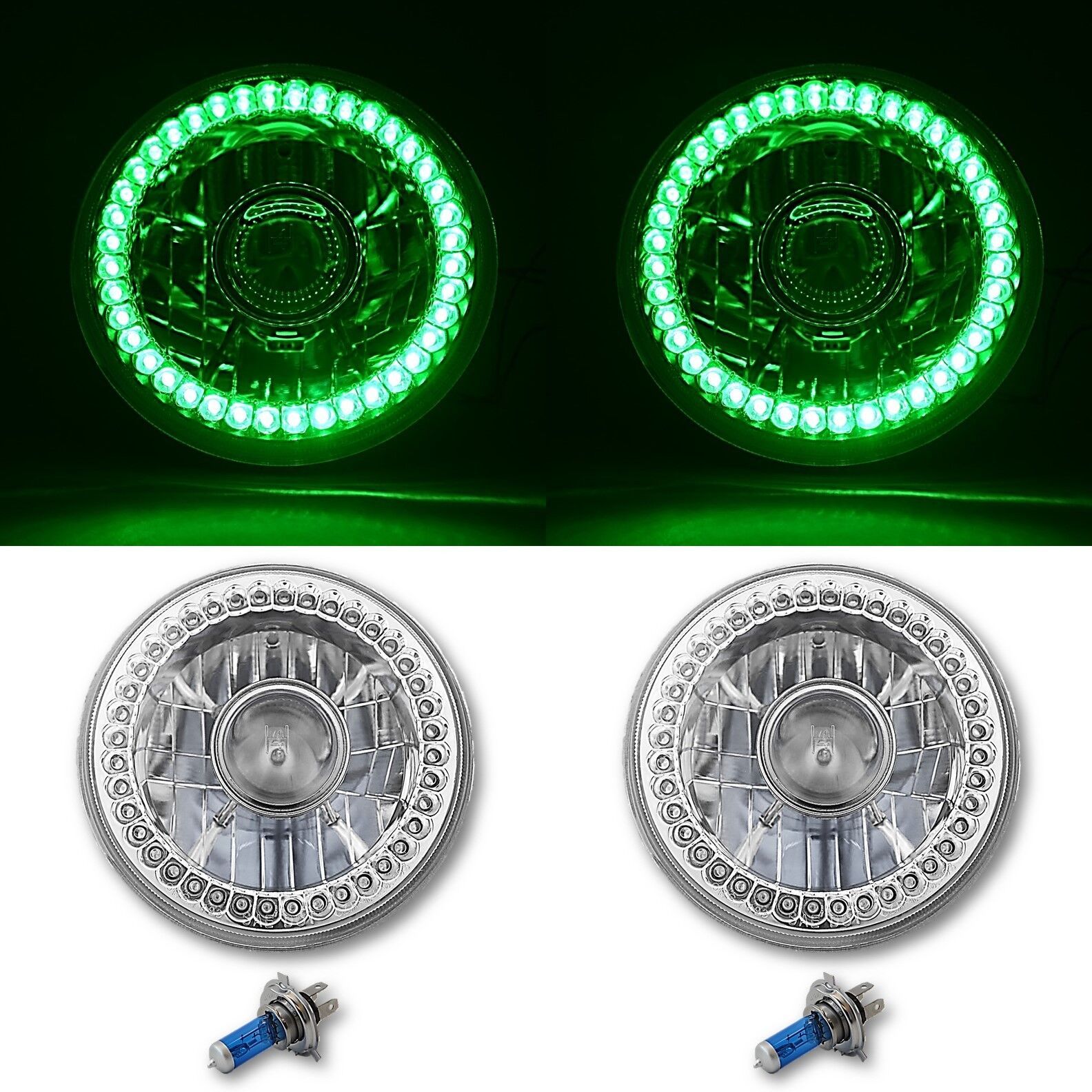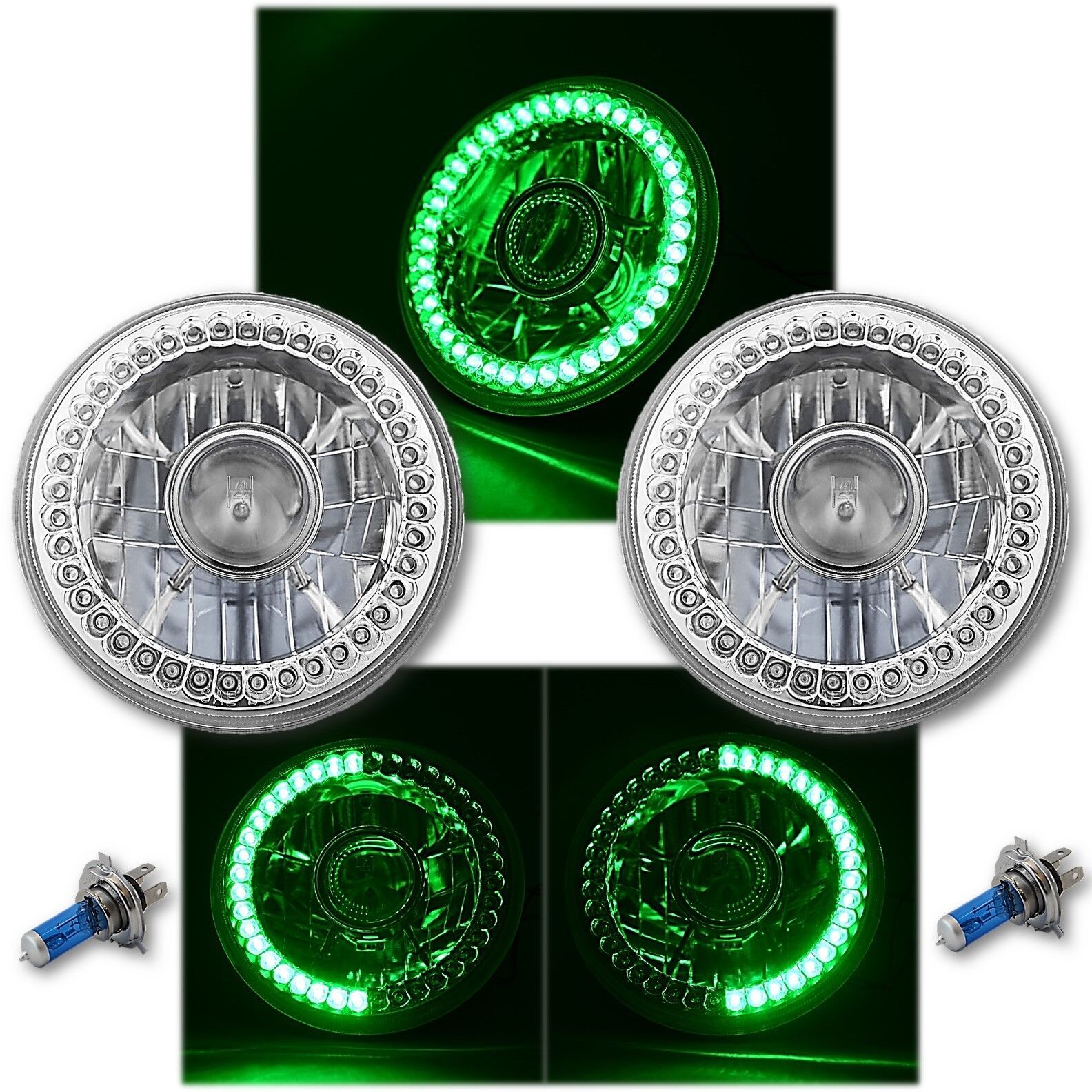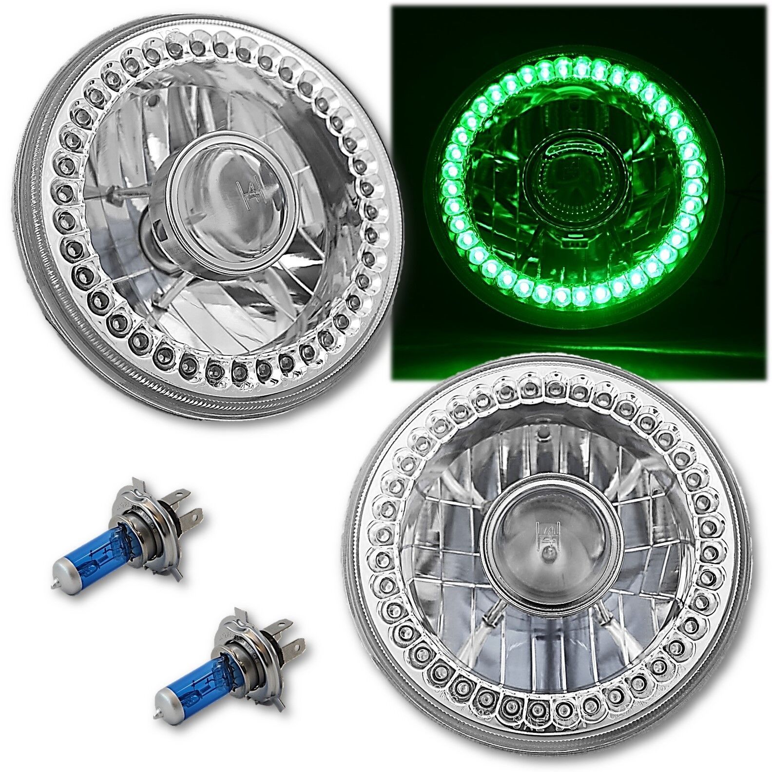 THIS LISTING IS FOR A NEW PAIR (2 HEADLIGHTS) OF 7" 12 VOLT HIGH/LOW BEAM HALOGEN HEADLIGHTS WITH 40-GREEN LEDS . THESE ARE GLASS HEADLIGHTS. THE GREEN LEDS CAN BE WIRED AS A FULL RING OR SPLIT INTO LEFT AND RIGHT SIDE TURN SIGNALS. THESE LIGHT UP 50% BRIGHTER AND LIGHT UP WHITE COMPARED THE STANDARD STOCK STYLE INCANDESCENT HEADLIGHT BULBS THAT LIGHT UP YELLOW. INCLUDES 60/55W SUPER WHITE H4 BULBS AND H4 TO H13 WIRE ADAPTER PLUGS FOR JEEPS THAT HAVE H13 BULBS. THESE HAVE THE ORIGINAL 3 PRONG PLUG DESIGN ON THE BACK SO THEY WILL PLUG RIGHT INTO THE ORIGINAL WIRING HARNESS. LED HALO RINGS ARE WIRED SEPARATELY. THESE WILL FIT STOCK BUCKETS, BUT IN SOME CASES MINOR MODIFICATION TO THE HEADLIGHT BUCKET AND/OR WIRING MAY BE REQUIRED.