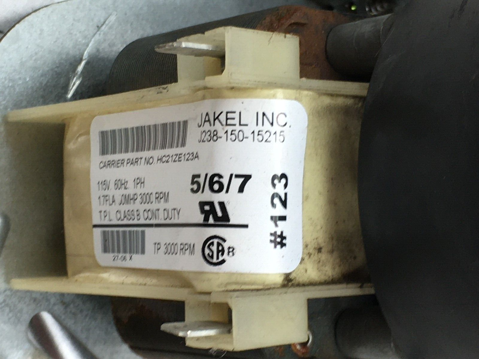 This is JAKEL J238-150-15215 Draft Inducer Blower Motor HC21ZE123A 115V 3000 RPM 60Hz used previously, refurbished part, excellent working condition.
