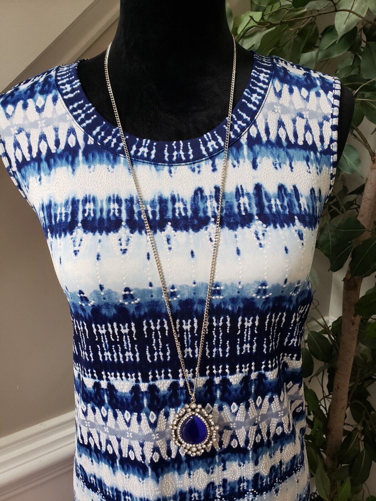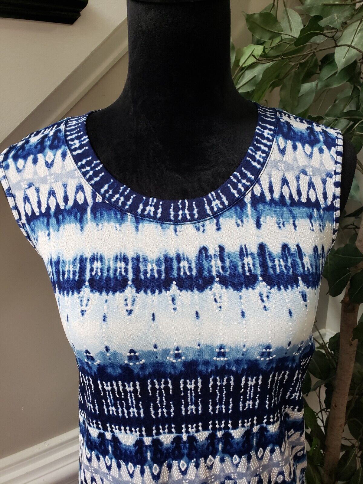 AGB Womens Blue White Polyester Round Neck Sleeveless Knee Length Dress Size M.