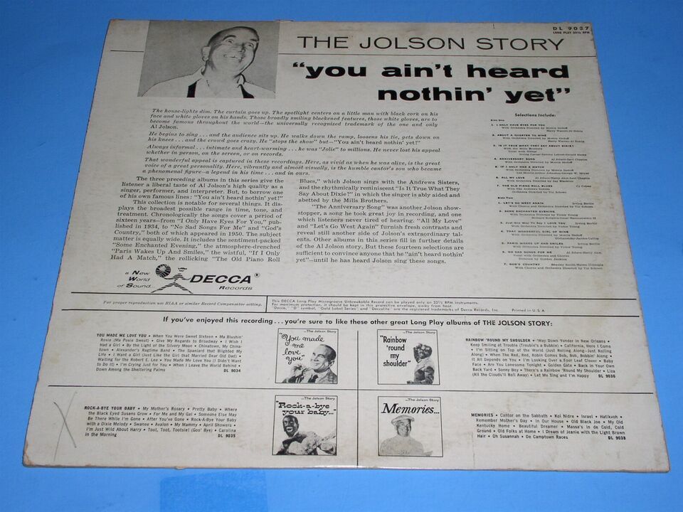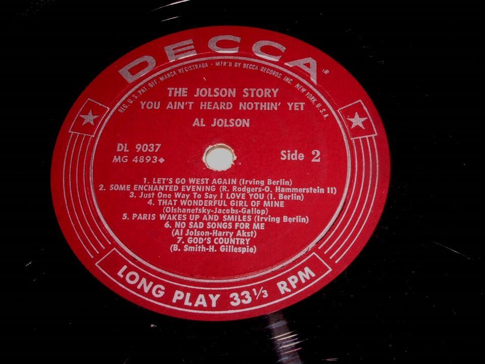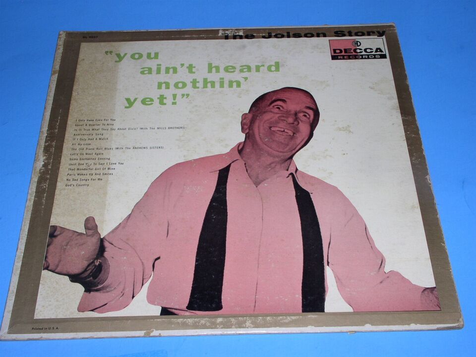 This is a vintage phonograph record album entitled, "The Jolson Story, You Ain't Heard Nothin' Yet!". Record label Decca DL 9037 (mono). This has the maroon label with silver writing.