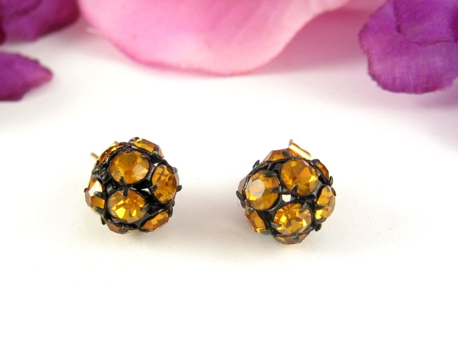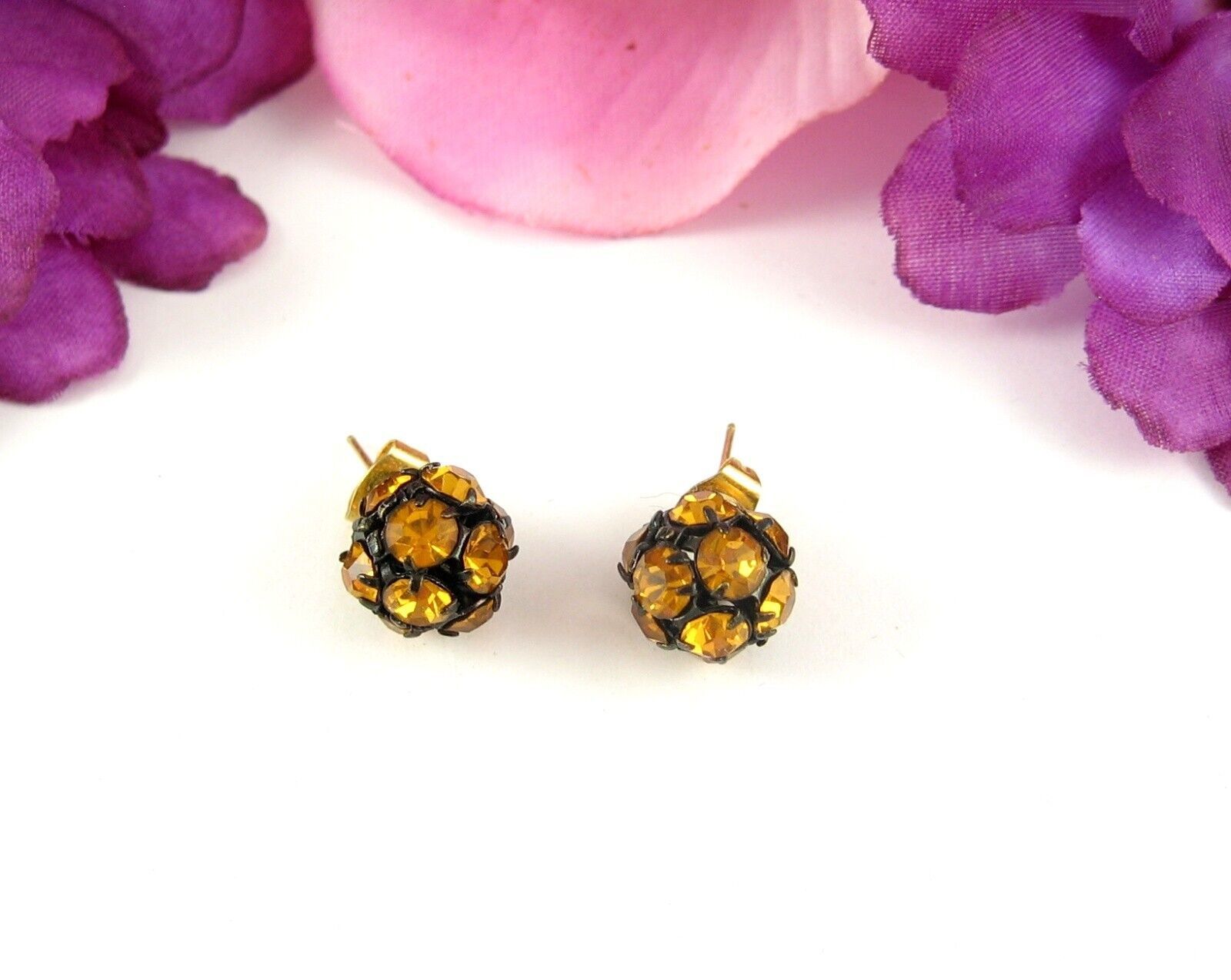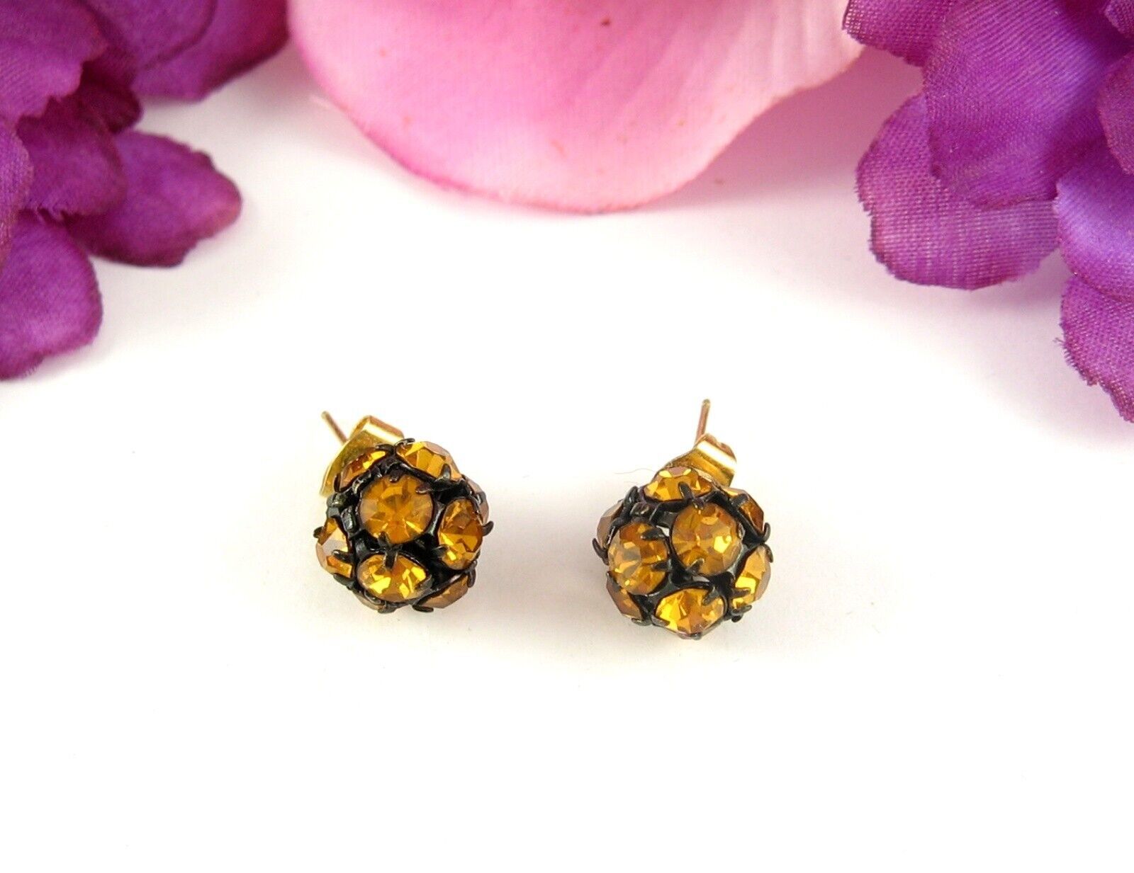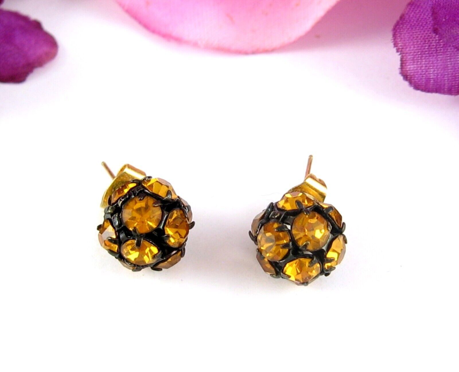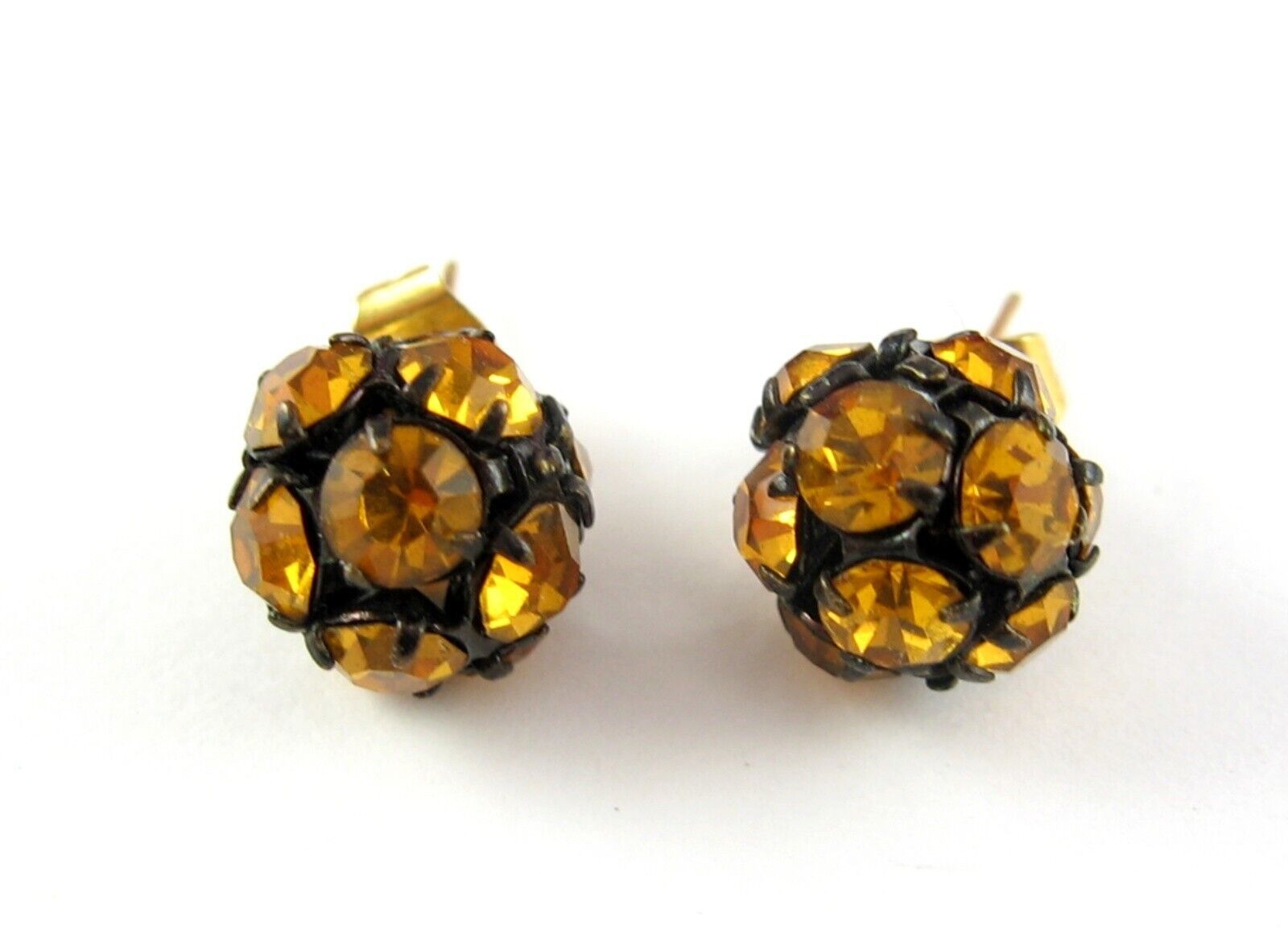 Vintage RHINESTONE DISCO BALL EARRINGS Pierced Post GOLDEN YELLOW Black Stud