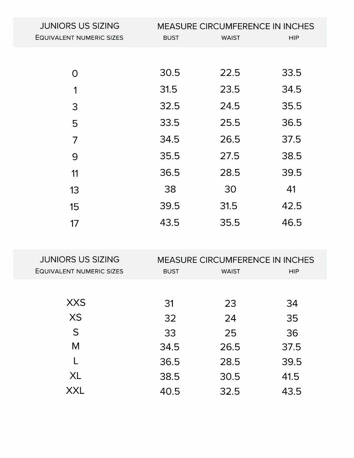 Find the perfect fit in Juniors to Women?s size equivalents: 0=0, 1=0, 3=2, 7=6, 9=8, 11=10, 13=12, 15=14, 17=16, 19=18