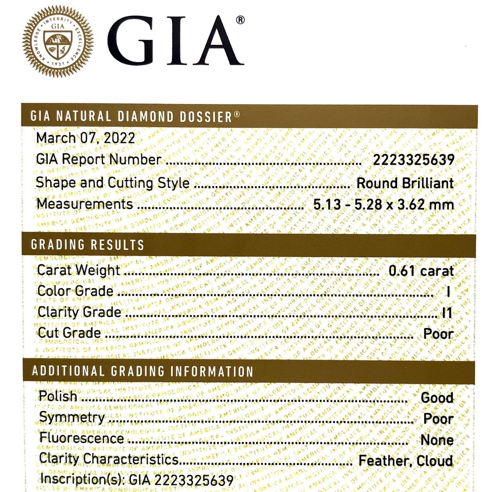 Art Deco platinum hand engraved .61ct diamond engagement ring. The GIA report #2223325639 states round brilliant cut natural diamond measuring 5.13mm x 5.28mm x 3.62mm with I color and I1 clarity. The diamond is set in four new prongs. There is pierced filigree on the sides and hand engraving on three sides of the band going a little over 1/2 way around the shank. There are ten small round brilliant cut round diamond accents weighing about .08ct total. There are ten new bead prongs on the diamond accents.