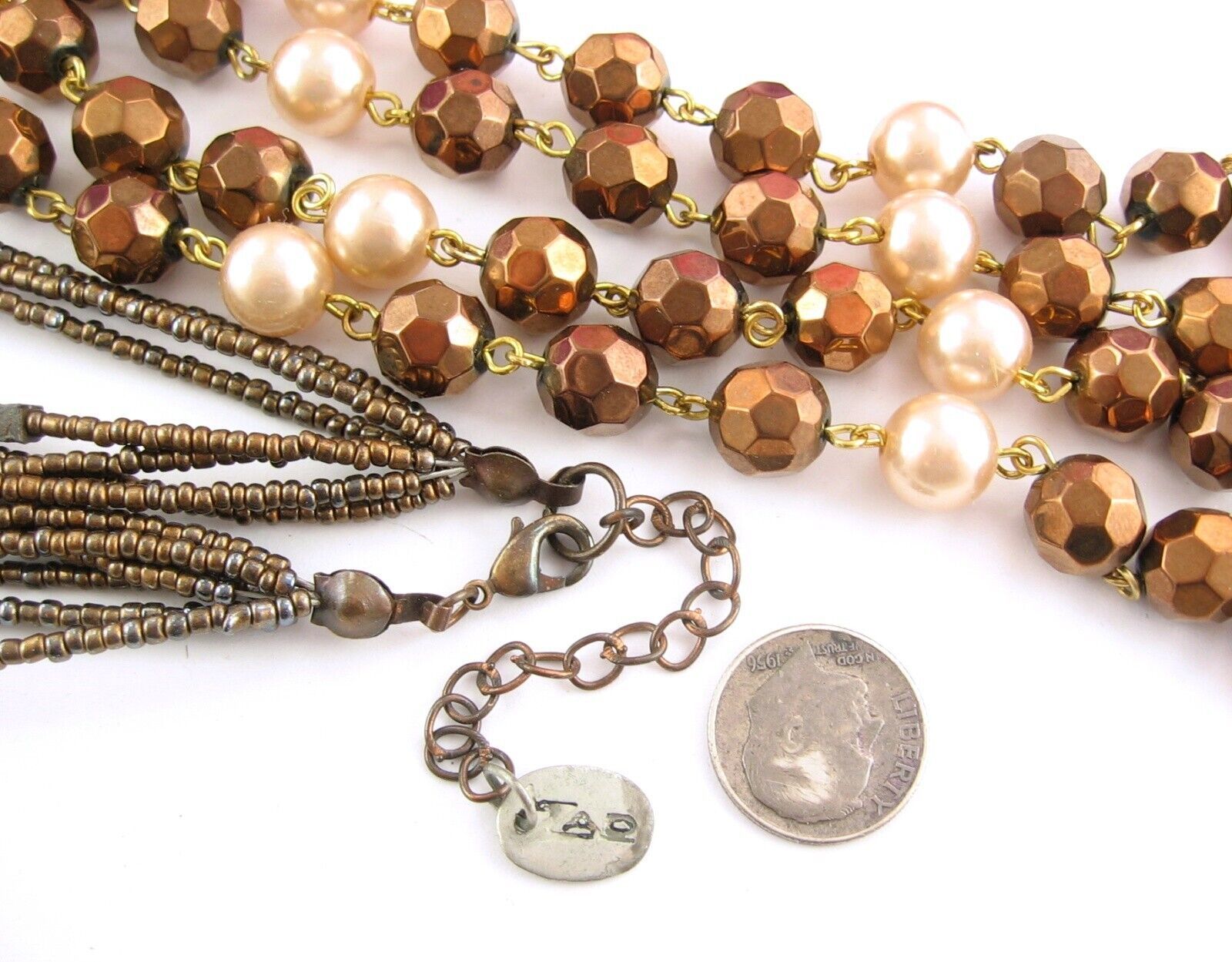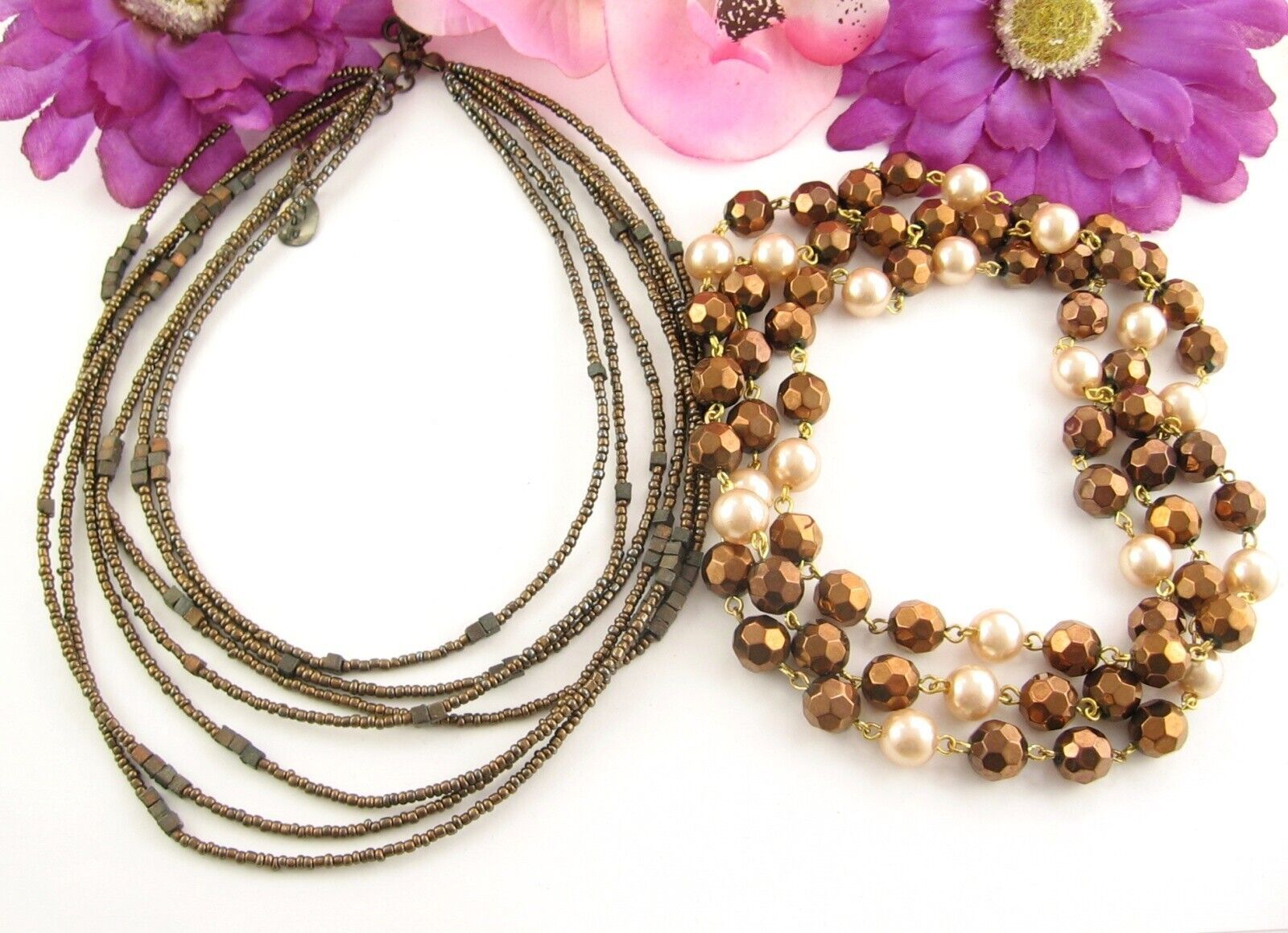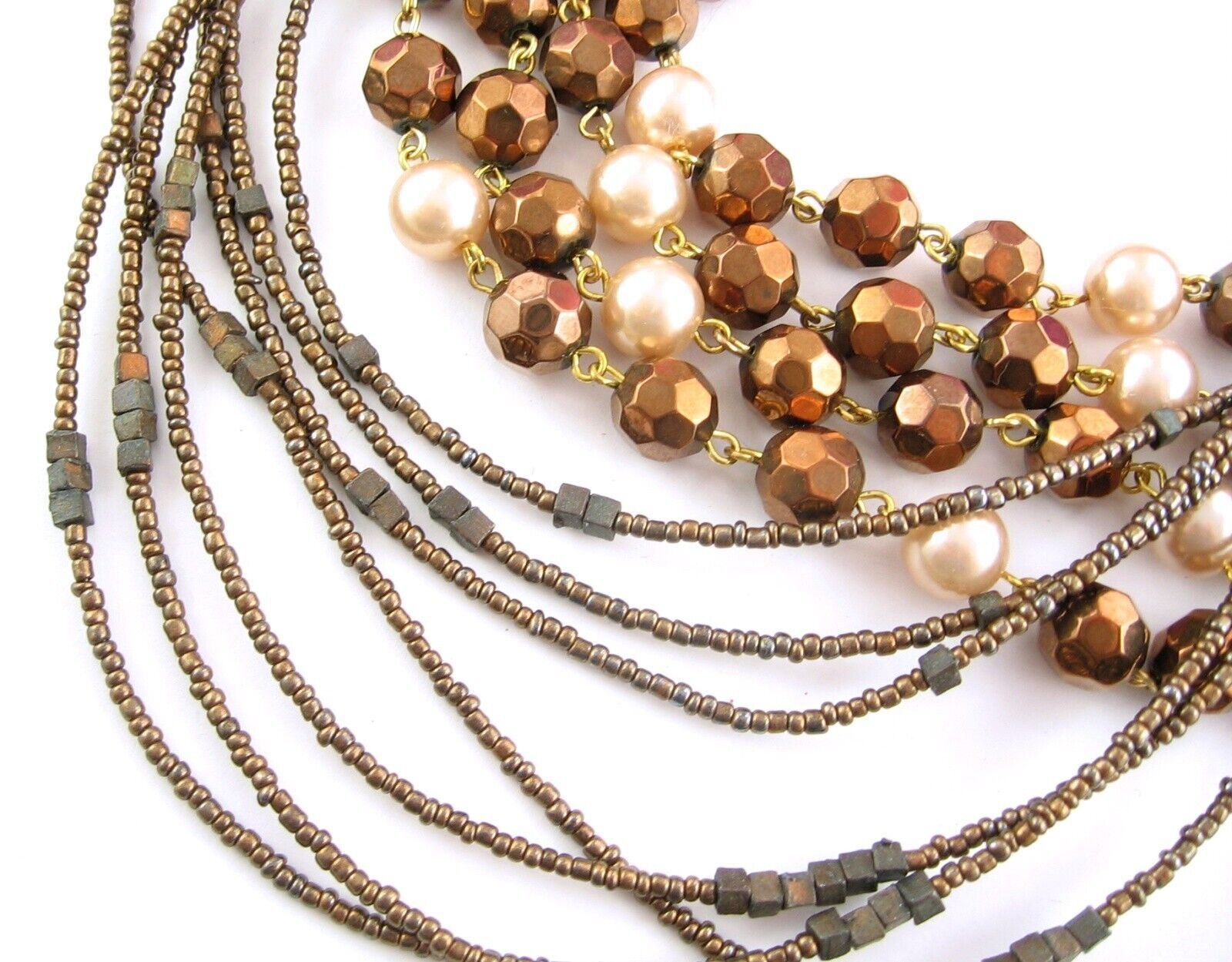 Set - ZAD 7 Strand COPPERTONE Seedbead NECKLACE Vintage GLASS BEADED Faux Pearl