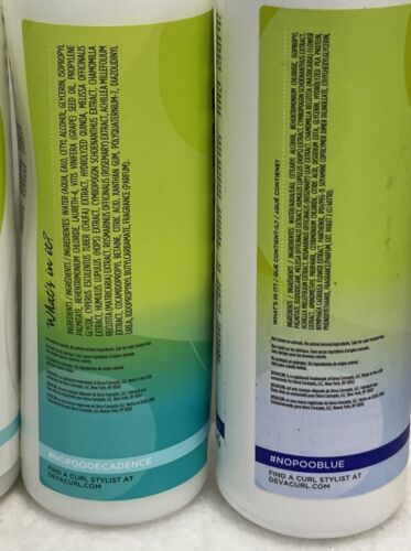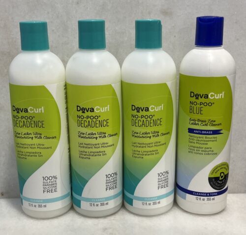 Devacurl No Poo (3) Decadence Zero Lather Ultra Moisturizing Milk Cleanser (1) Blue Anti-Brass Zero Lather Curl Cleanser 12 oz each