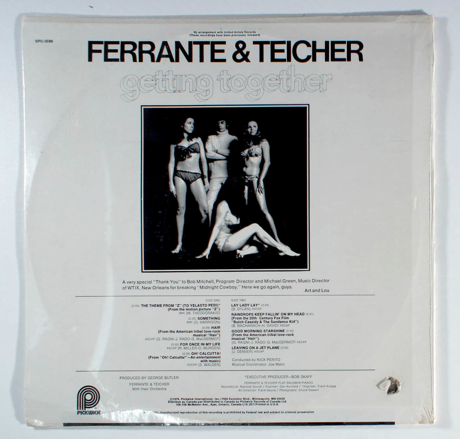 On Getting Together, Louis Teicher and Art Ferrante go back to movie themes and show tunes as well as popular songs that Bob Crewe and others were bringing to life on the airwaves. In doing so they hit a home run with this LP. Recorded at National Sound with production by Dr. George Butler, the boys bring back that "water guitar" found on the Box Tops Cried Like a Baby, and their own Midnight Cowboy, giving it to the Bob Dylan cover Lay Lady Lay. A strange mix of their eclectic, experimental side melting into commercial glitz makes for an interesting combination. They churned out so much product at this point in time that their creativity sometimes took a back seat to giving the people what they want. Art and Lou successfully merge the two concepts on this collection, a terrific instrumental version of George Harrison's Something segues into a rendition of Hair that has no hint of the Cowsills frivolity. The Toys get a nod with the duo's play on Bach, calling it A Familiar Concerto, leaving songwriters Sandy Linzer and Denny Randell out in the cold in regards to their version of Johann Sebastian's pop hit. Art Lou take all the credit with "Arranged by Ferrante Teicher" giving them the royalties. The arpeggios and interesting production return with Good Morning Starshine; here they allow unfolding sounds to play with the speakers, as did Bob Crewe's production of Oliver in 1969. The traditional and eternal favorite, Colonel Bogie March, concludes an LP with diverse material.