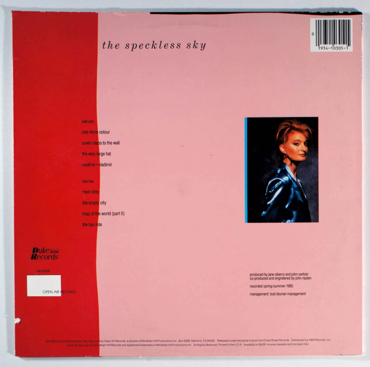 The Speckless Sky, by Jane Siberry is her highest-charting album on the Canadian charts and contains her biggest Top 40 hit, One More Colour. The album's second single, Map of the World (Part II), was also a hit on Canada's adult contemporary charts. The Speckless Sky is no longer available on CD.