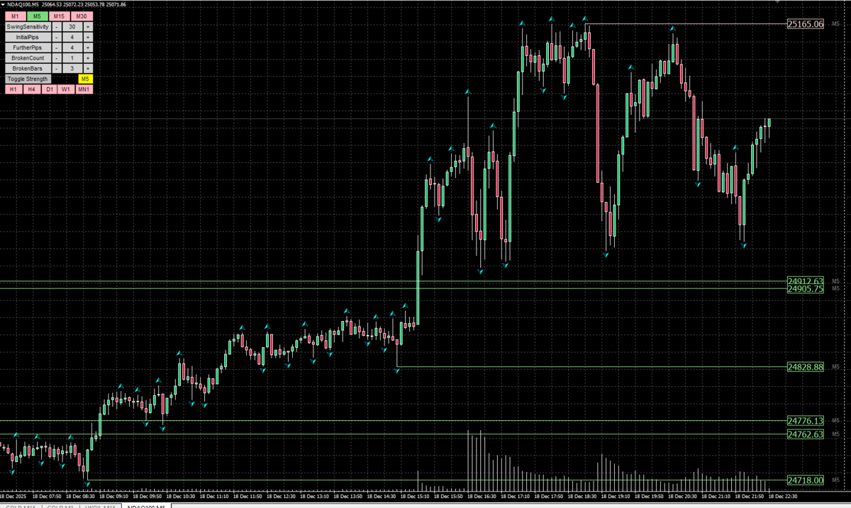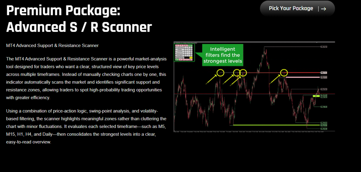 Using a combination of price-action logic, swing-point analysis, and volatility-based filtering, the scanner highlights meaningful zones rather than cluttering the chart with minor fluctuations. It evaluates each selected timeframe—such as M5, M15, H1, H4, and Daily—then consolidates the strongest levels into a clear, easy-to-read overview.