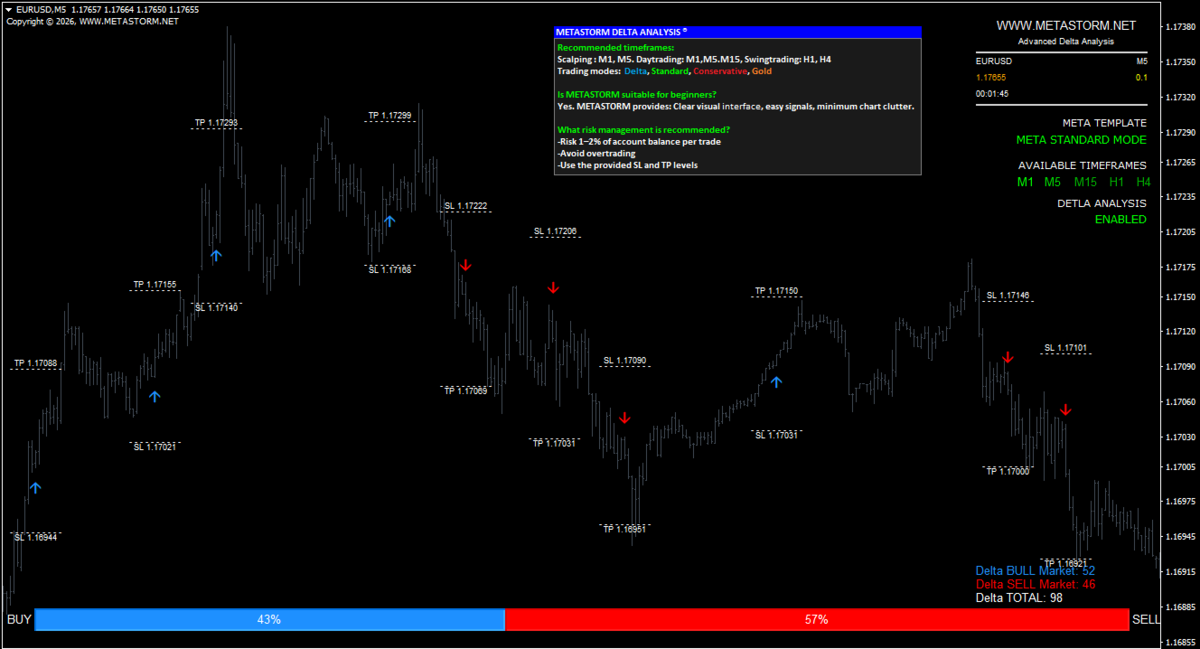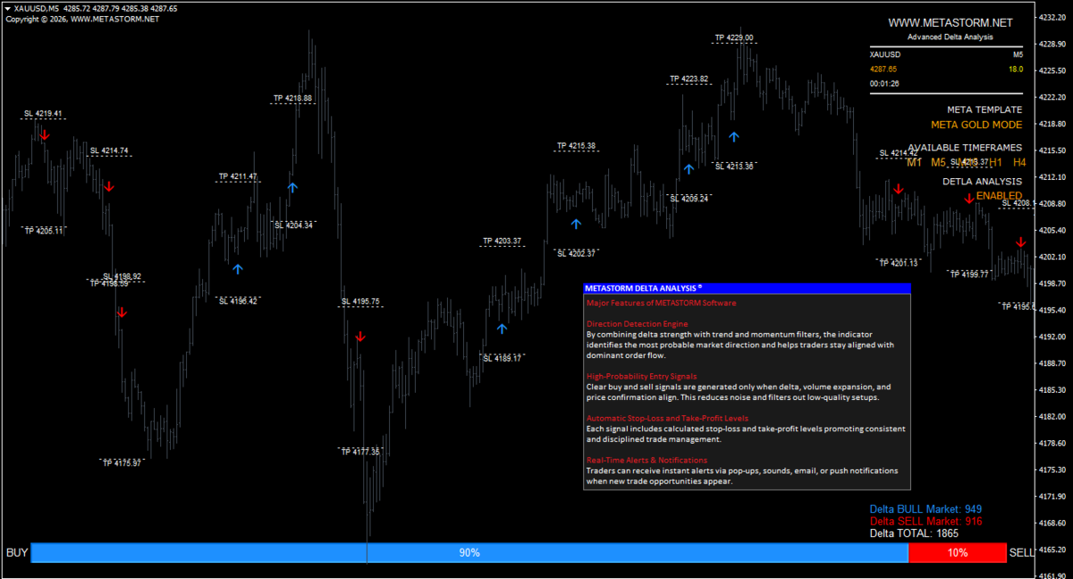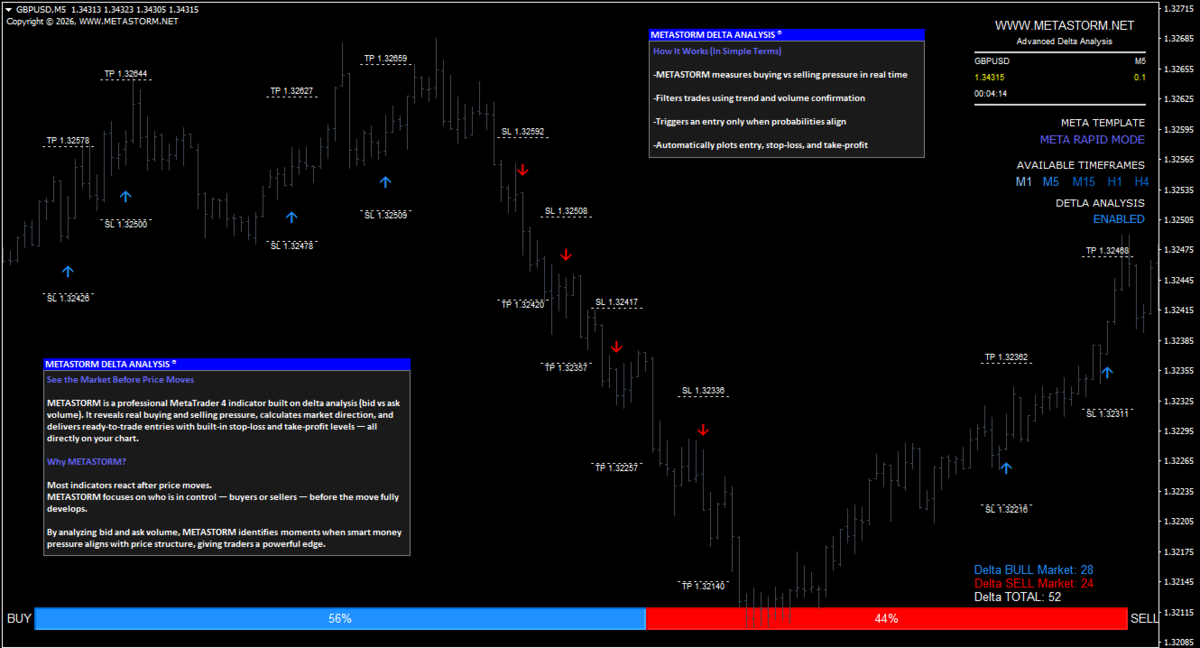 Meta Storm is an MT4 indicator that uses Delta analysis (bid/askvolume) to generate accurate entry signals and provide detailedtake-profit and stop-loss levels. It helps traders identify where realbuying or selling is happening beneath price.Meta Storm purpose it togive traders clearer, higher-probability entry signals — all driven byDelta analysis. The software reads who’s actually aggressing themarket (buyers or sellers) and turns that flow into actionable tradesuggestions.