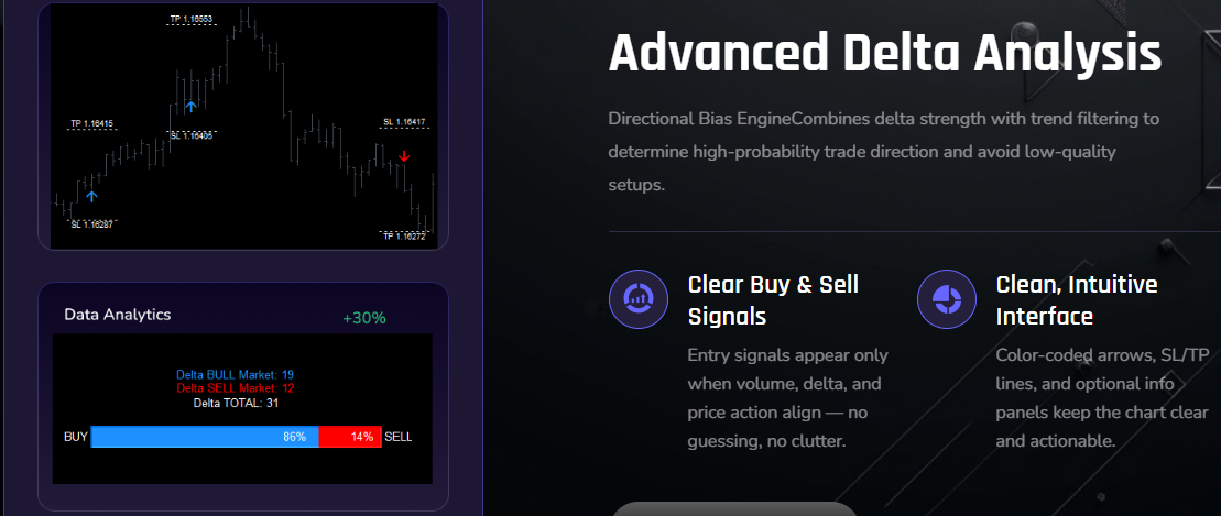 Advanced Delta / Order-Flow Logic: reads the balance between buyers and sellers (bid/ask volume), not just price movement.