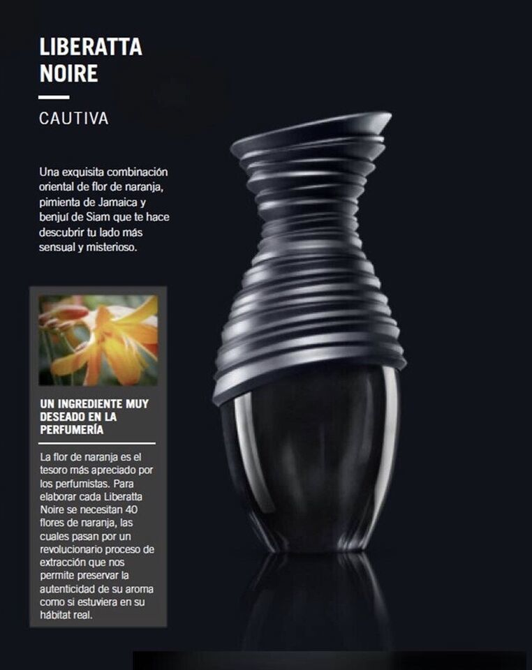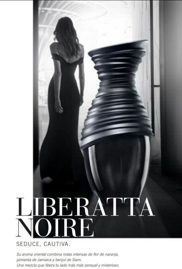 Liberatta Noire te conquistara no solamente con su fragancia, sino tambien con su exclusivo empaque. Su frasco excepcional sugiere un vestido negro, prenda infaltable de la coleccion de los mas famosos diseñadores. Su original diseño fue premiado en el prestigioso concurso internacional