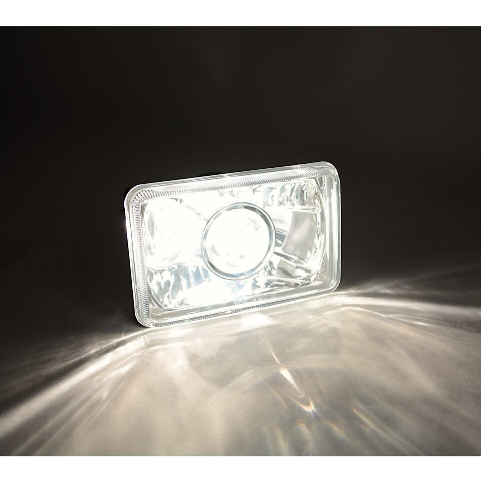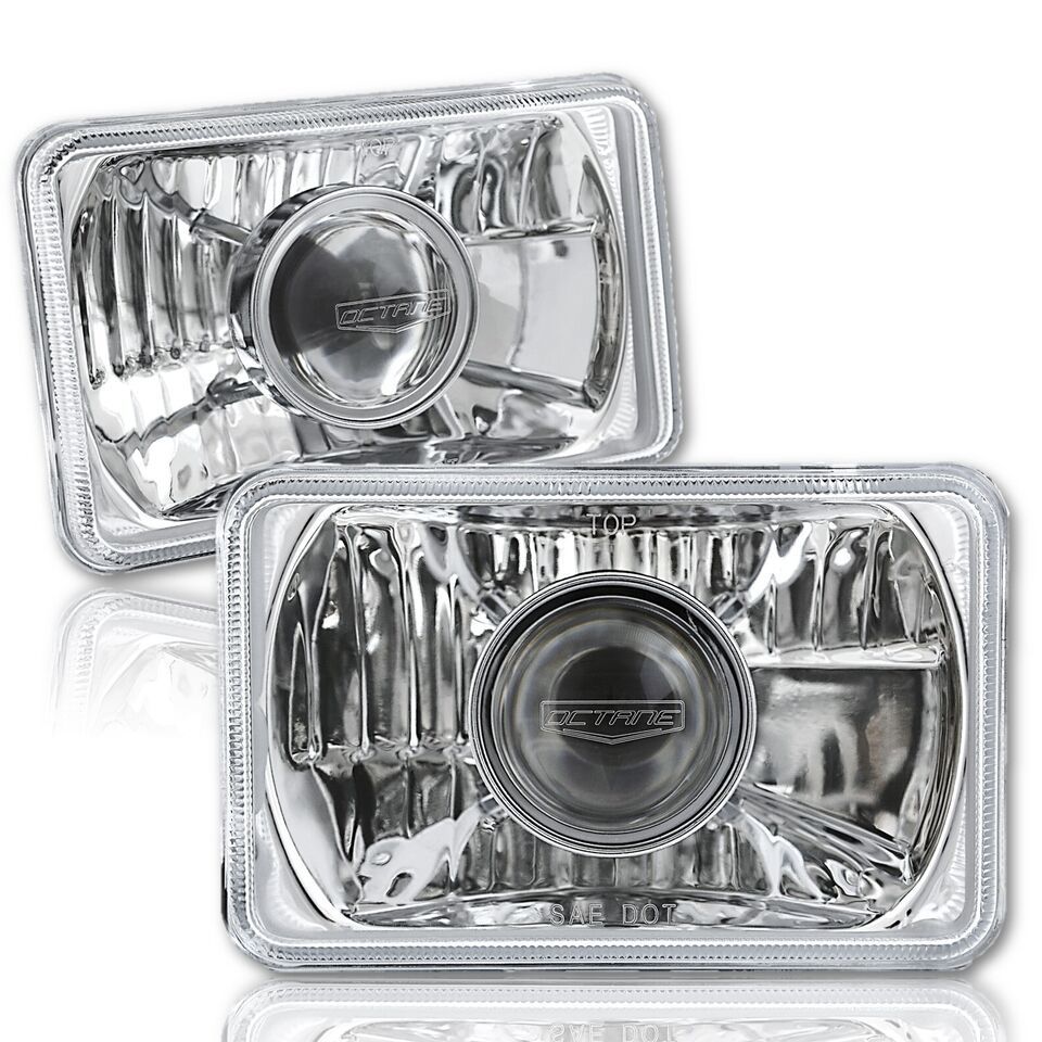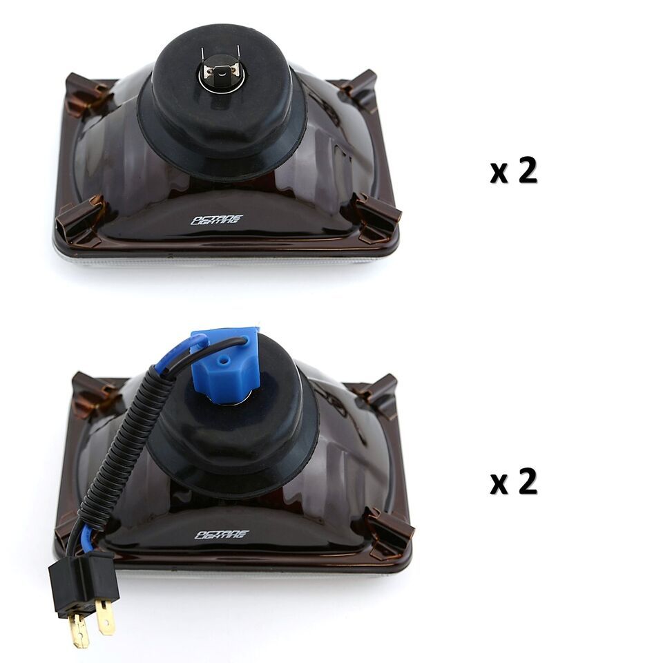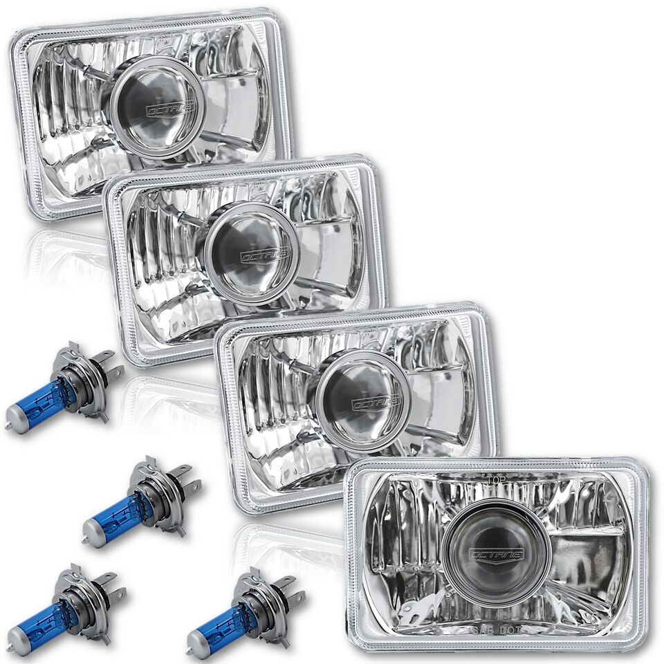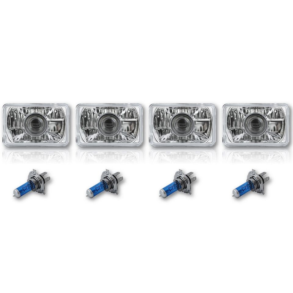 THIS LISTING IS FOR A NEW SET OF 4 - 4x6" CRYSTAL CLEAR GLASS LENS / METAL BACKSIDE H4 CONVERSION PROJECTOR HEADLIGHTS WITH 55/60W HALOGEN LIGHT BULBS. THIS SET INCLUDES 2 HIGH BEAM 2 HIGH / LOW BEAM HEADLIGHTS. THESE HAVE THE ORIGINAL SHAPED PRONGS ON THE BACK SO THEY WILL PLUG RIGHT INTO YOUR ORIGINAL WIRING HARNESS PLUGS. THESE LIGHT UP 50% BRIGHTER THEN THE STOCK STYLE INCANDESCENT BULBS. IN RARE CIRCUMSTANCES, WIRING MODIFICATION MAY BE REQUIRED.THESE ARE FOR ANY CAR OR TRUCK THAT HAS 4 SQUARE 4x6" HEADLIGHTS.