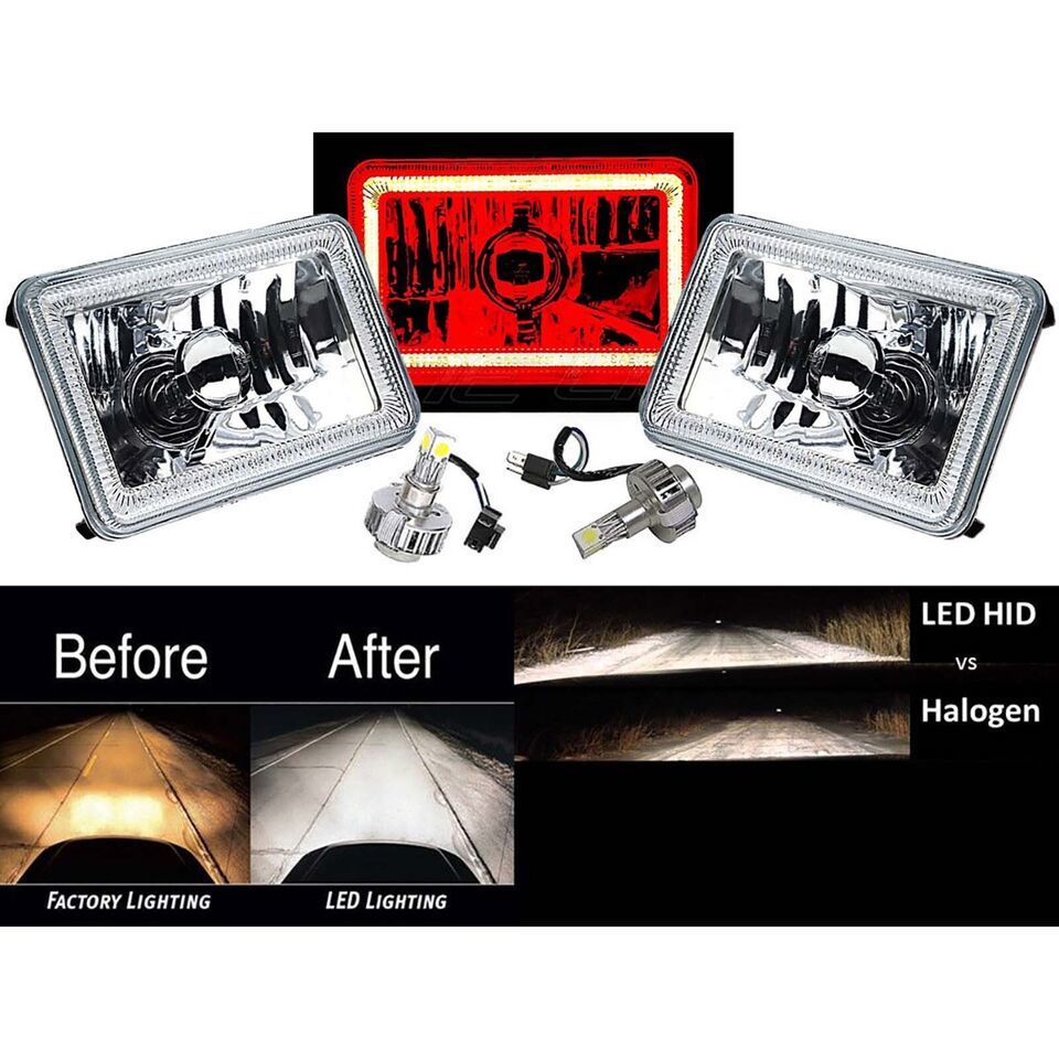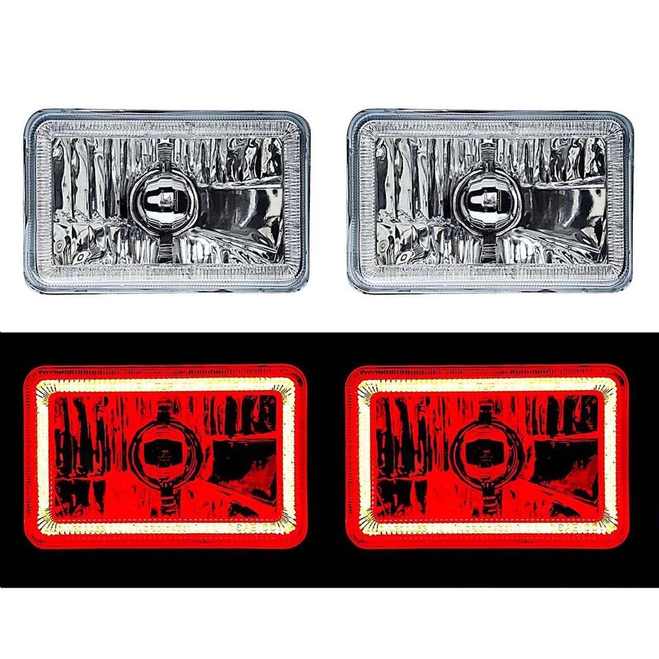 THIS LISTING IS FOR A NEW PAIR - 4x6" CRYSTAL CLEAR GLASS LENS / METAL BACKSIDE H4 CONVERSION RED LED HALO HEADLIGHTS WITH 6K WHITE LED H4 BULBS. THIS SET INCLUDES (2) LOW/HIGH BEAM HEADLIGHTS. THESE HAVE THE ORIGINAL SHAPED PRONGS ON THE BACK SO THEY WILL PLUG RIGHT INTO YOUR ORIGINAL WIRING HARNESS PLUGS. IN RARE CIRCUMSTANCES, WIRING MODIFICATION MAY BE REQUIRED. HALO RING IS POWERED BY A