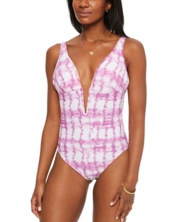 Take a stylish plunge in this daring look, a one-piece with soft tie-dyed stripes and a deep neckline. Non-removable cups Moderate bottom coverage Pull-on styling; over-the-shoulder straps Plunging V-neck Open back Lined Nylon/spandex; lining: polyester Hand wash Imported