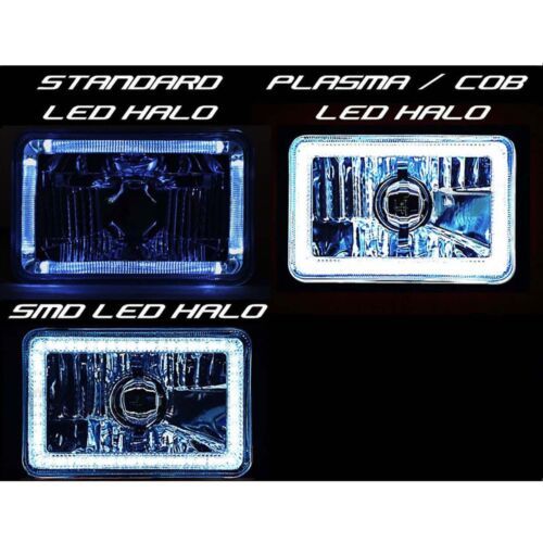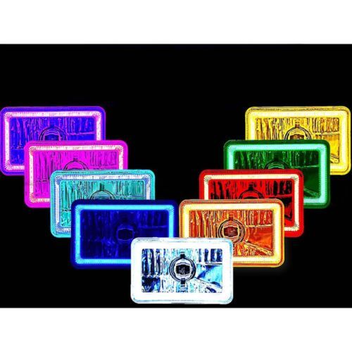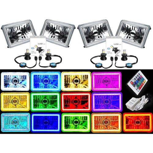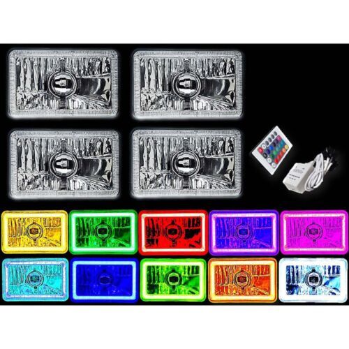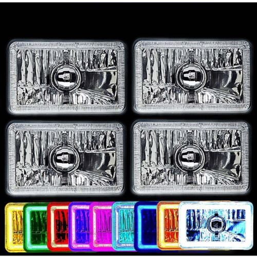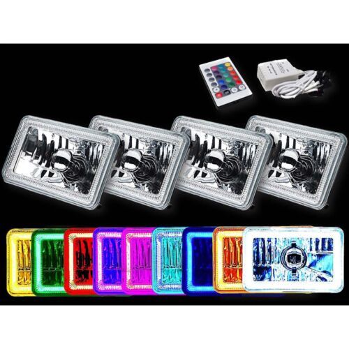 THIS LISTING IS FOR A NEW SET OF 4 - 4x6" CRYSTAL CLEAR GLASS LENS / METAL BACKSIDE H4 CONVERSION RGB MULTI-COLOR CHANGING LED HALO HEADLIGHTS. THIS SET INCLUDES 2 HIGH BEAM 2 HIGH / LOW BEAM HEADLIGHTS. ALSO INCLUDES 5th GEN LED 6000K WHITE LED BULBS. THESE HAVE THE ORIGINAL SHAPED PRONGS ON THE BACK SO THEY WILL PLUG RIGHT INTO YOUR ORIGINAL WIRING HARNESS PLUGS. IN RARE CIRCUMSTANCES, WIRING MODIFICATION MAY BE REQUIRED.THESE ARE FOR ANY CAR OR TRUCK THAT HAS 4 SQUARE 4x6" HEADLIGHTS.