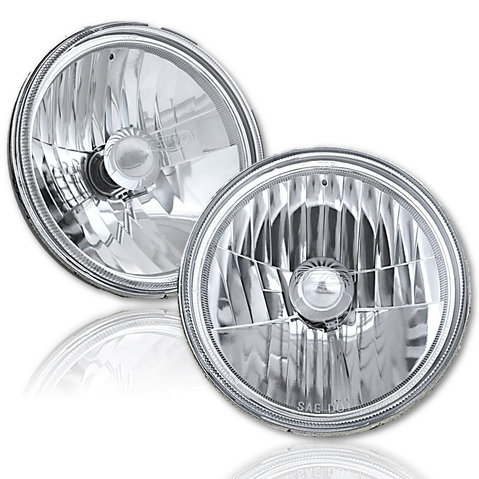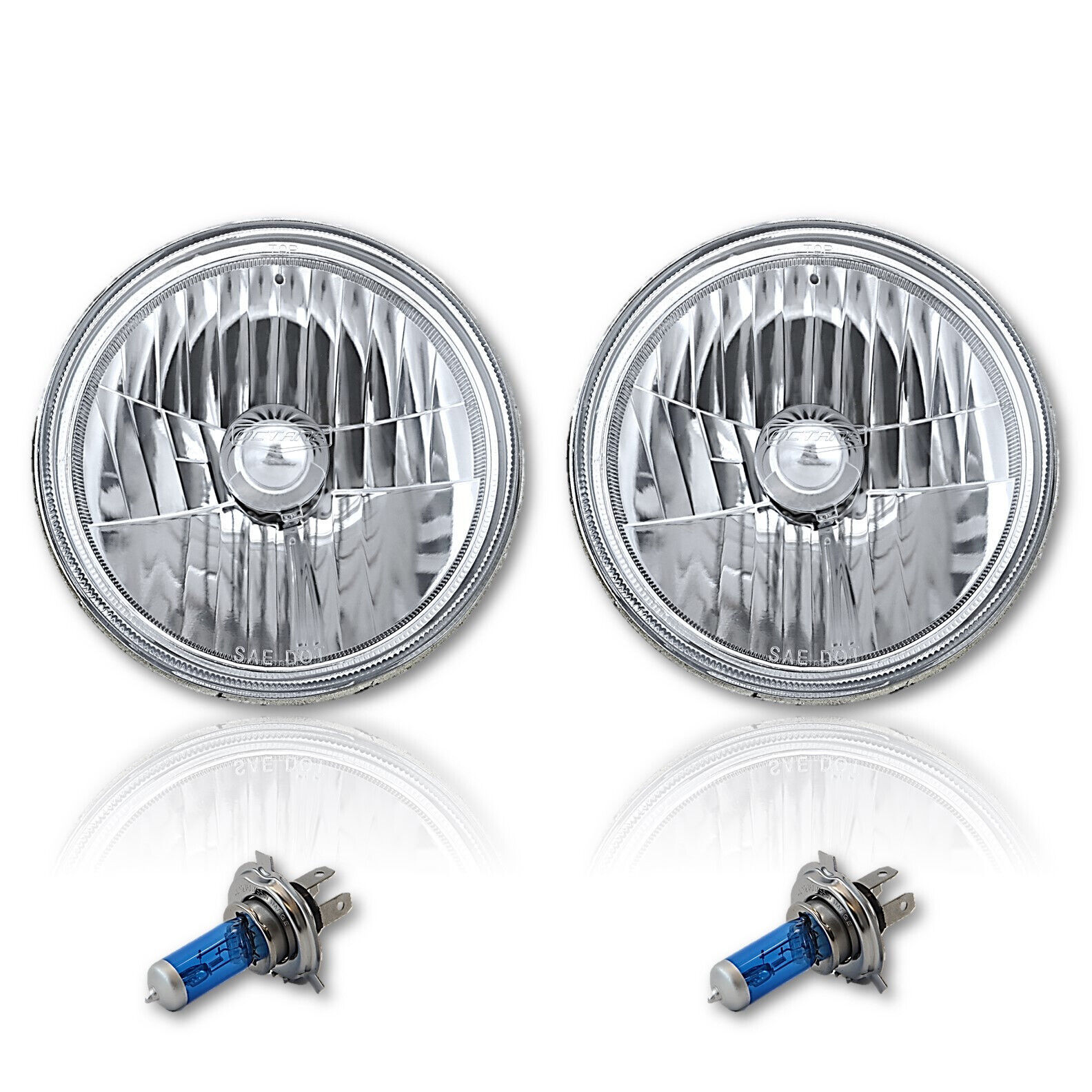 THIS LISTING IS FOR A NEW PAIR (2 BULBS RIGHT LEFT) 7" 12 VOLT HIGH/LOW BEAM CRYSTAL CLEAR SEMI-SEALED BEAM HALOGEN HEADLIGHTS, INCLUDES ULTRA WHITE BULBS 85/80W. THESE ARE GLASS FACED HEADLIGHTS. THESE LIGHT UP 50% BRIGHTER AND LIGHT UP A LITTLE MORE WHITE THEN THE STANDARD STOCK STYLE INCANDESCENT HEADLIGHT BULBS. THESE HAVE THE ORIGINAL 3 PRONG PLUG DESIGN ON THE BACK SO THEY WILL PLUG RIGHT INTO THE ORIGINAL WIRING HARNESS. THESE WILL FIT ANY CAR OR TRUCK THAT HAS 2 ROUND GLASS HEADLIGHTS THAT ARE 7 INCHES IN DIAMETER. THESE ARE GLASS AND WE WILL TAKE EXTRA CARE IN PACKAGING.