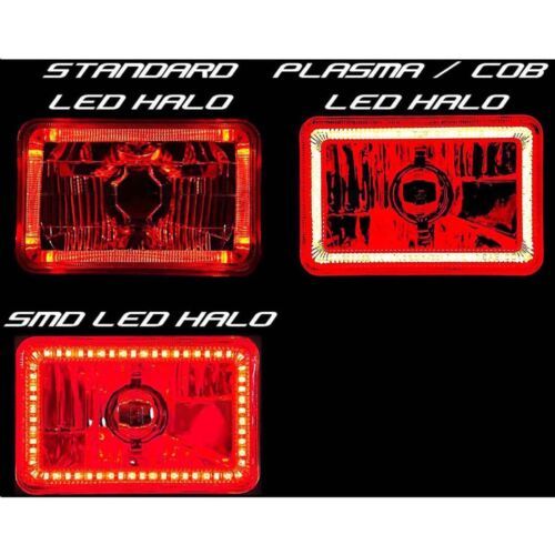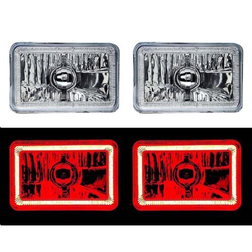 THIS LISTING IS FOR A NEW PAIR - 4x6" CRYSTAL CLEAR GLASS LENS / METAL BACKSIDE H4 CONVERSION RED LED HALO HEADLIGHTS. THIS SET INCLUDES (2) LOW/HIGH BEAM HEADLIGHTS. ALSO INCLUDES 5th GEN LED 6000K WHITE LED BULBS. THESE HAVE THE ORIGINAL SHAPED PRONGS ON THE BACK SO THEY WILL PLUG RIGHT INTO YOUR ORIGINAL WIRING HARNESS PLUGS. IN RARE CIRCUMSTANCES, WIRING MODIFICATION MAY BE REQUIRED.THESE ARE FOR ANY CAR OR TRUCK THAT HAS 4 SQUARE 4x6" HEADLIGHTS.