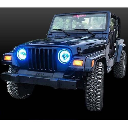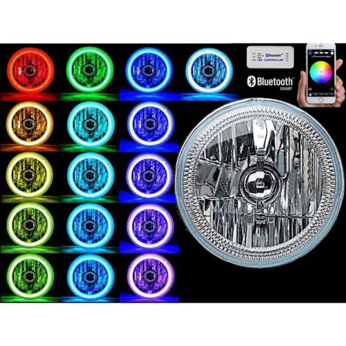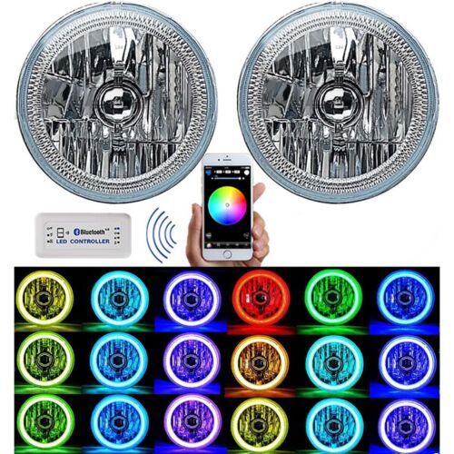 THIS LISTING IS FOR A PAIR OF 2 NEW 7" CRYSTAL CLEAR GLASS FACED / METAL BACKED HALOGEN HEADLAMP BULBS WITH SMD RGB COLOR CHANGING 45-LED HALO ANGEL EYE RING. INCLUDES XENON SUPER WHITE HALOGEN 60/55W H4 BULBS. THESE WILL FIT ANY CAR OR TRUCK THAT HAS 7 INCHES IN DIAMETER HEADLIGHTS. SOME MODIFICATION TO THE HEADLIGHT BUCKET OR WIRING MAY BE REQUIRED. HALO RING IS POWERED BY A 12V POWER WIRE AND A GROUND WIRE. SAE AND DOT APPROVED. THESE ARE GLASS AND WE WILL TAKE EXTRA CARE IN PACKAGING.