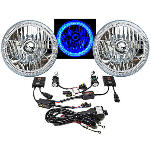 THIS LISTING IS FOR A NEW PAIR (2 bulbs) OF 7" 12 VOLT HIGH/LOW BEAM 6000K HID HEADLIGHTS WITH BLUE SMD 45-LED HALO ANGEL EYE RINGS. THESE HALO RINGS ARE EXTREMELY BRIGHT AND CAN EASILY BE SEEN DURING THE DAY AND NIGHT EVEN WITH THE HEADLIGHT ON. THESE HEADLIGHTS HAVE GLASS LENSES. THESE ARE A NIGHT AND DAY DIFFERENCE IN BRIGHTNESS COMPARED TO STOCK BULBS. THIS SET INCLUDES 2 LOW/HIGH BEAM HEADLIGHTS WITH 35W HID LIGHT BULBS AND H4 TO H13 ADAPTER WIRING PLUG. INCLUDES RELAY HARNESS THAT HAS THE ORIGINAL SHAPED PRONGS ON THE CONNECTOR SO IT WILL PLUG RIGHT INTO YOUR ORIGINAL WIRING HARNESS PLUG. THE STOCK FACTORY HEADLIGHT SWITCH AND DIMMER SWITCH WILL STILL BE USED TO CONTROL THE HEADLIGHTS HEADLIGHTS AND SWITCH FROM LOW TO HIGH BEAM BUT THE RELAY HARNESS WILL DRAW THE POWER DIRECTLY FROM THE BATTERY VIA THE WIRING HARNESS RELAY. LED RING IS POWERED WITH A POWER AND GROUND WIRE THAT CAN BE SPLICED DIRECTLY TO THE CARS 12V ELECTRICAL SYSTEM. HALO RINGS CAN BE CONNECTED TO PARKING LIGHTS, TURN SIGNALS, HEADLIGHTS, OR A SEPARATE SWITCH. THESE ARE DOT SAE APPROVED. WE WILL TAKE EXTRA CARE IN PACKAGING.