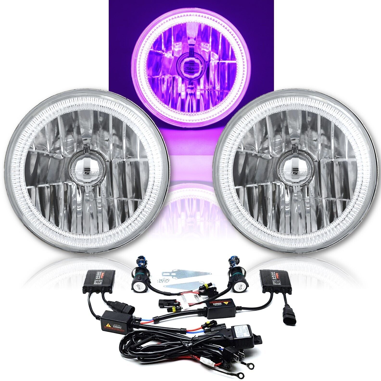 THIS LISTING IS FOR A NEW PAIR (2 bulbs) OF 7" 12 VOLT HIGH/LOW BEAM 6000K HID HEADLIGHTS WITH PURPLE COB LED HALO ANGEL EYE RINGS. THESE HALO RINGS ARE EXTREMELY BRIGHT AND CAN EASILY BE SEEN DURING THE DAY AND NIGHT EVEN WITH THE HEADLIGHT ON. THESE HEADLIGHTS HAVE GLASS LENSES AND A METAL BACKING. THESE ARE A NIGHT AND DAY DIFFERENCE IN BRIGHTNESS COMPARED TO STOCK BULBS. THIS SET INCLUDES 2