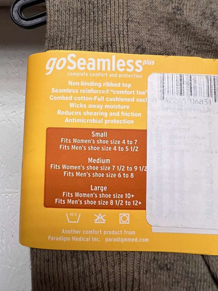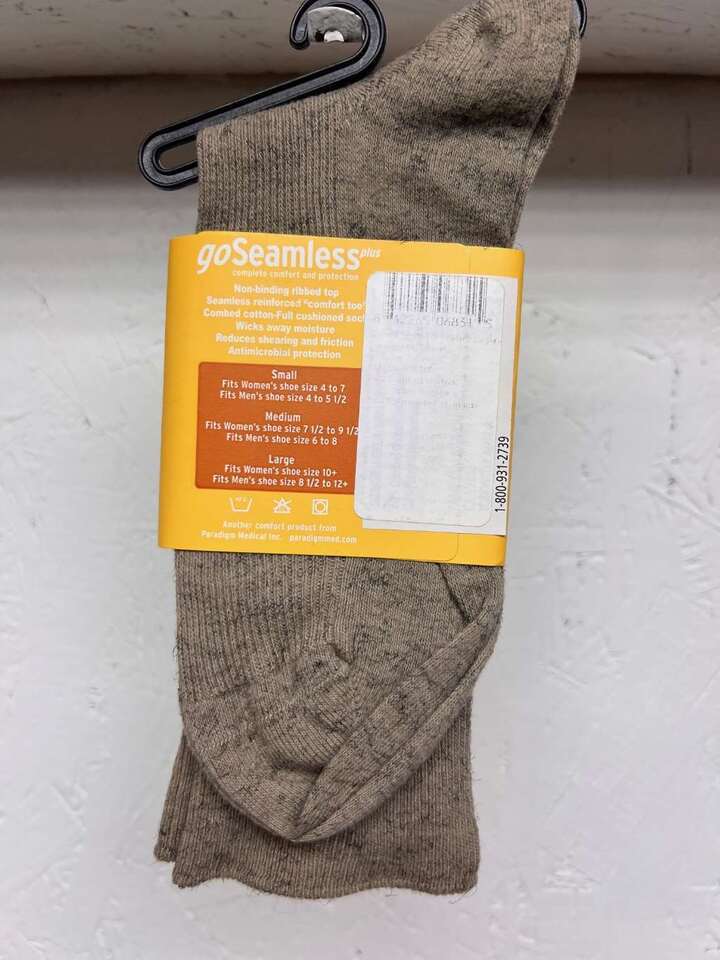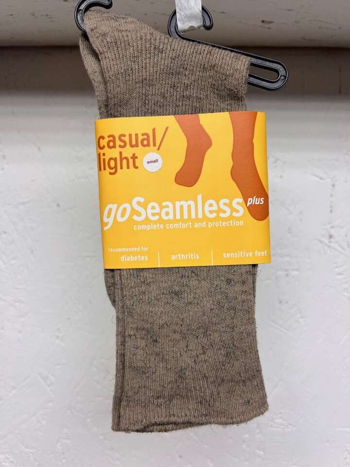 Description : GoSeamless Casual Light Socks Beige Small Description Casual (Diabetic) Socks goSeamless No inside seam, no irritating ridges Non-binding foot and calf comfort Constructed to provide extra cushioning as well as a smooth fit without pressure, bunching and tightness Soft combed cotton construction. Wicks away moisture Suitable for all shoe types?dress, casual, orthopedic, sport and boots Recommended for: Diabetes, Arthritis and Sensitive Feet See our store \r\n "the second offer" \r\n