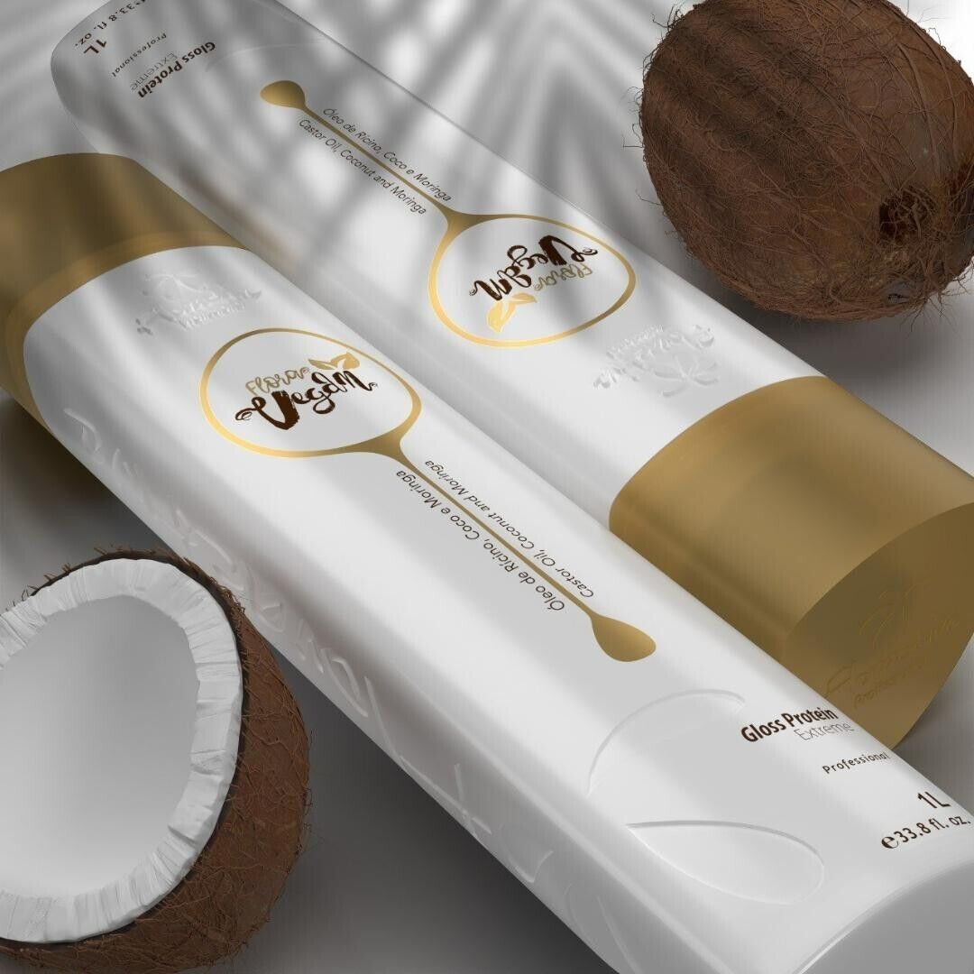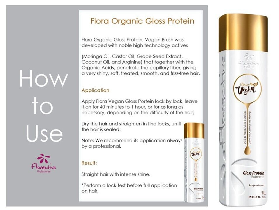 Flora Organic Gloss Protein, Vegan Brush was developed with noble actives of high technology (Moringa Oil, Castor Oil, Grape Seed Extract, Coconut Oil and Arginine that together with Organic Acids, penetrate the hair fiber, giving a very shiny, soft, treated, straight and frizz-free hair. Application Apply Flora vegan Gloss Portein lock by lock, let it act from 40 minutes to 1 hour, or in the necessary time depending on the difficulty of the hair; Dry the hair and board in fine locks, until sealing the hair. Note: We recommend the application always by a professional. Result: Straight hair with intense shine. *Perform lock test before full application on hair.