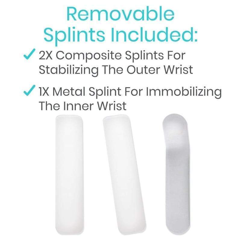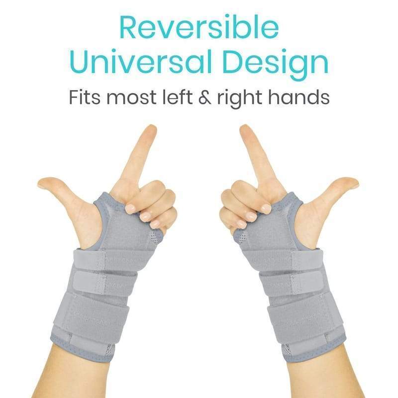Description : VIVE Reversible Wrist Brace Black One Size WRIST STABILIZATION Hasten healing and prevent re-injury by supporting and protecting your wrist and palm in a comfortable brace ADJUSTABLE COMPRESSION THERAPY Relieve pain and swelling from arthritis, carpal tunnel, tendonitis, surgery, sprains and strains WEAR ON EITHER HAND Reversible design adjusts to fit both the right and left hand and most hand sizes ALUMINUM AND PLASTIC SPLINTS Three removable splints provide extra support to increase comfort and stability SOFT NEOPRENE Breathable neoprene blend will keep your skin comfortable and cool all day STRONG HOOK AND LOOP STRAPS Extra secure fastening straps ensure the brace will not slip or twist while wearing See our store \r\n "the second offer" \r\n