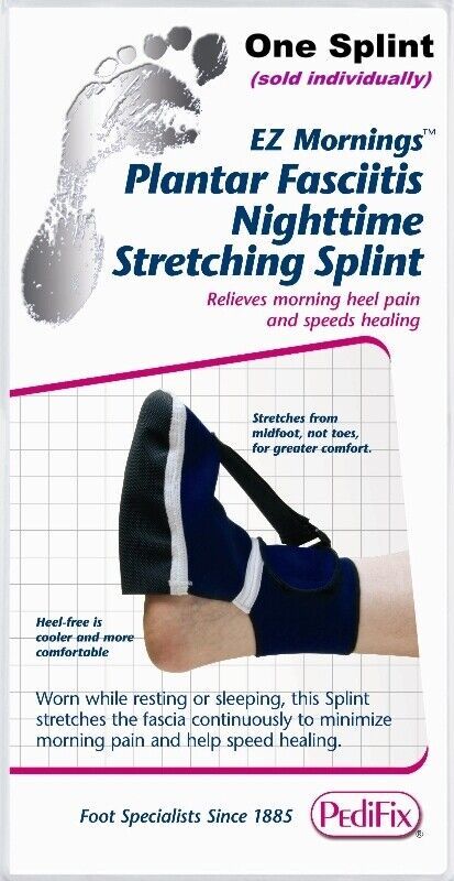 Description : PediFix EZ Mornings Plantar Fasciitis Nighttime Stretching Splint Large. The PediFix EZ Mornings Heel Relief Stretching Splint relieves heel pain caused by Plantar Fasciitis and Achilles Tendonitis . The heel free design is cool and comfortable. Heel pain is most often related to strain or microscopic tears of the ' Plantar Fascia ' ligament on the bottom of the foot that connects the heel to the toes.