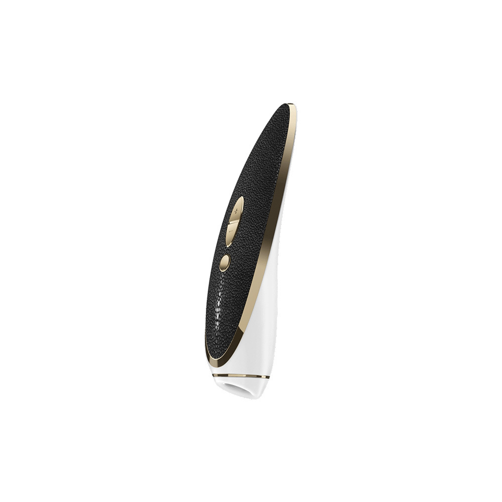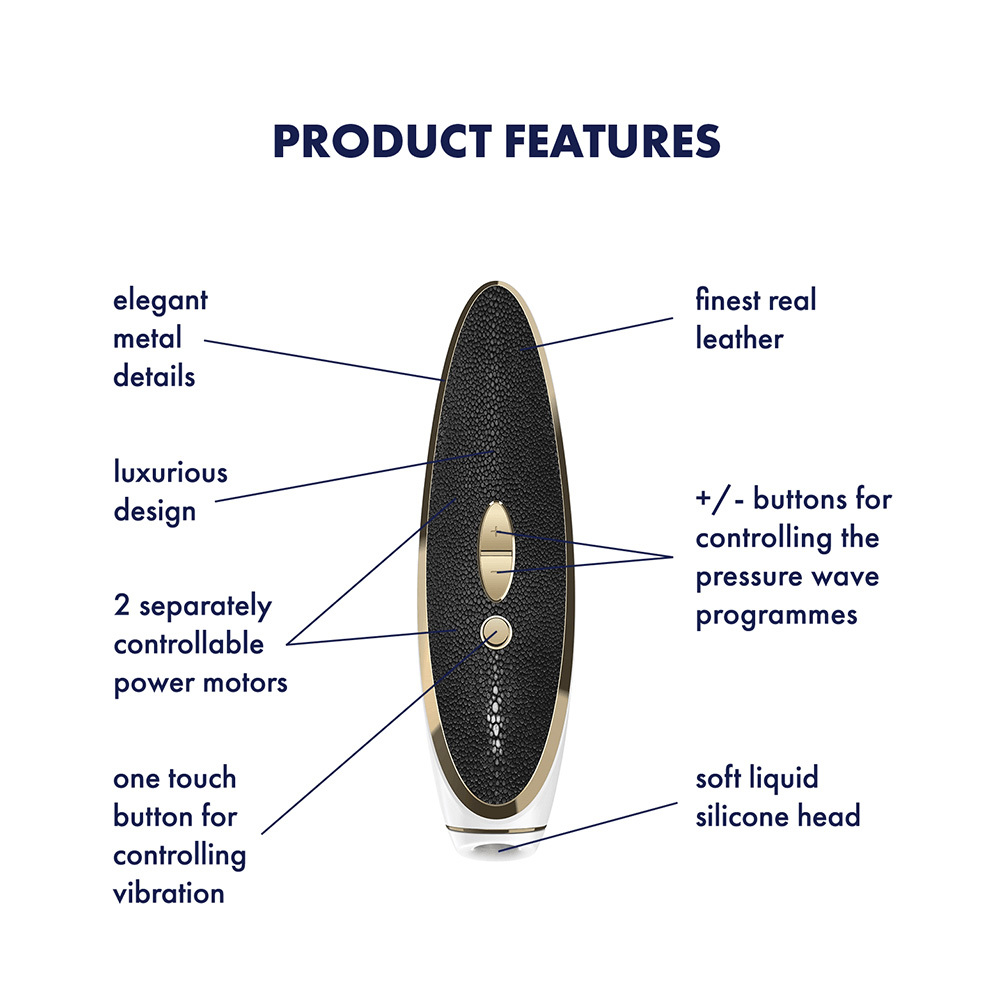 This luxury gem is designed with precious detail in mind. Featuring materials such as black leather, gold detailing, and soft medical grade silicone, this toy offers a refined touch for your cultivated taste and clitoral satisfaction. Made with genuine leather and prescious metals. Simultaneous stimulation of the clitoris using pressure waves and vibrations. 11 pressure wave intensities and 10 vibration programmes offer variety for ultimate pleasure.