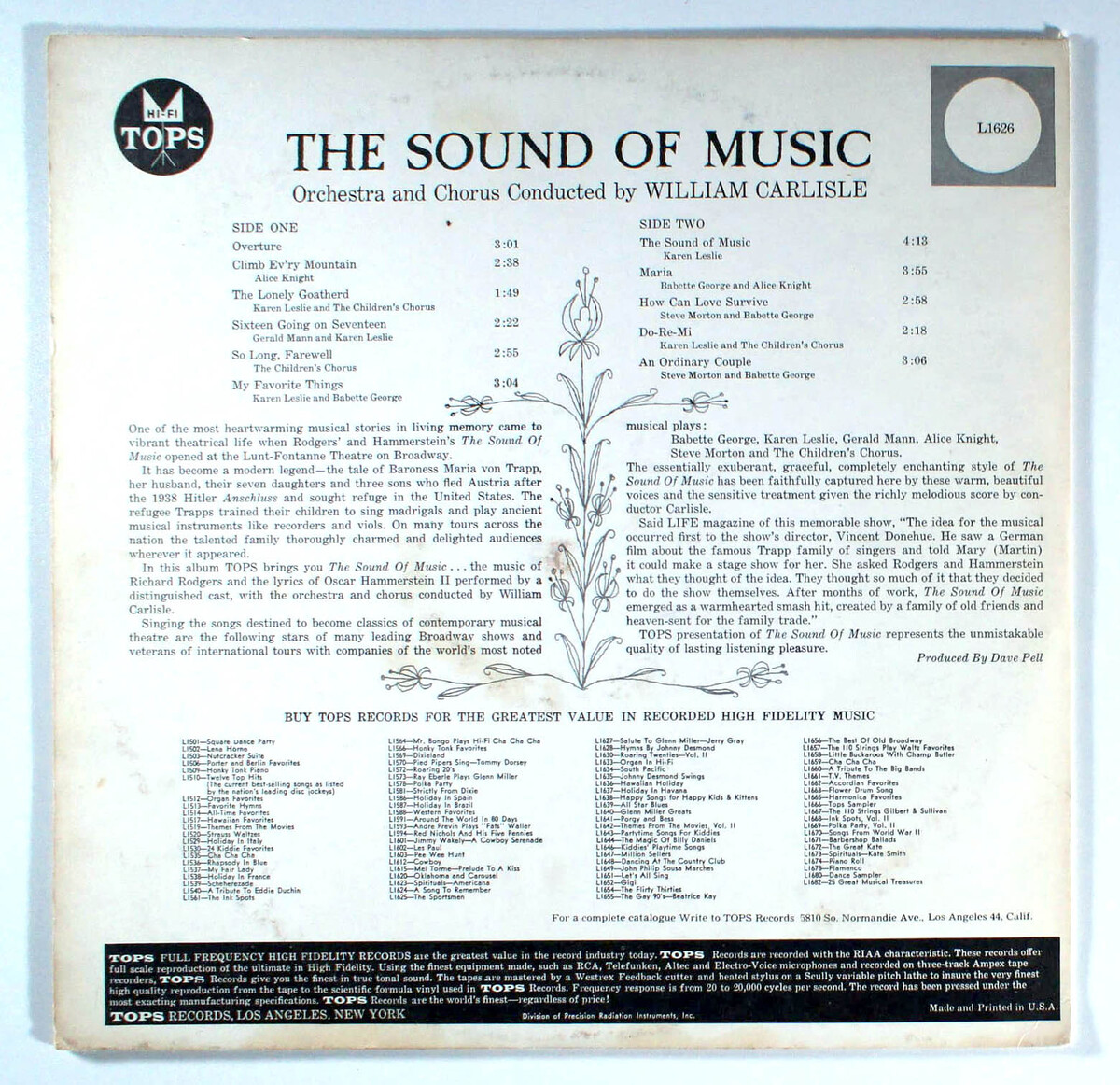 In this album TOPS brings you The Sound of Music...The music of Richard Rodgers and the lyrics of Oscar Hammerstein II performed by a distinguished cast, with the orchestra and chorus conducted by William Carlisle. Singing the songs destined to become classics of contemporary musical are stars of many leading Broadway shows and veterans of international tours with companies of the world's most noted musical plays. TOPS presentation of The Sound of Music represents the unmistakable quality of lasting listening pleasure.