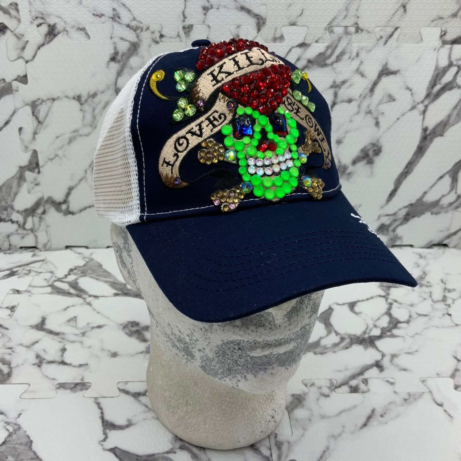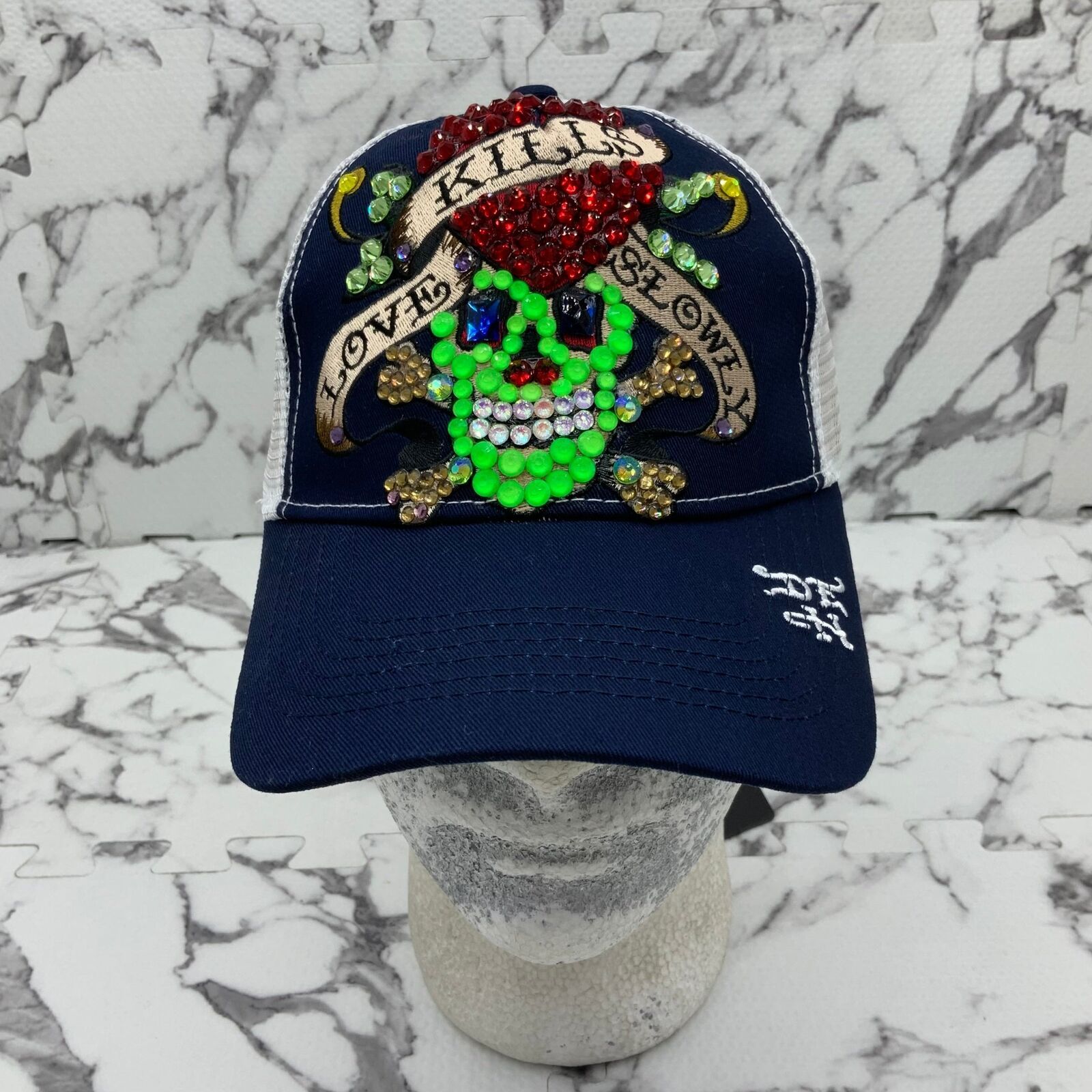 Men's Ed Hardy Love Kills Slowly Navy | White | Lime Green Rhinestone Trucker Hat NWT