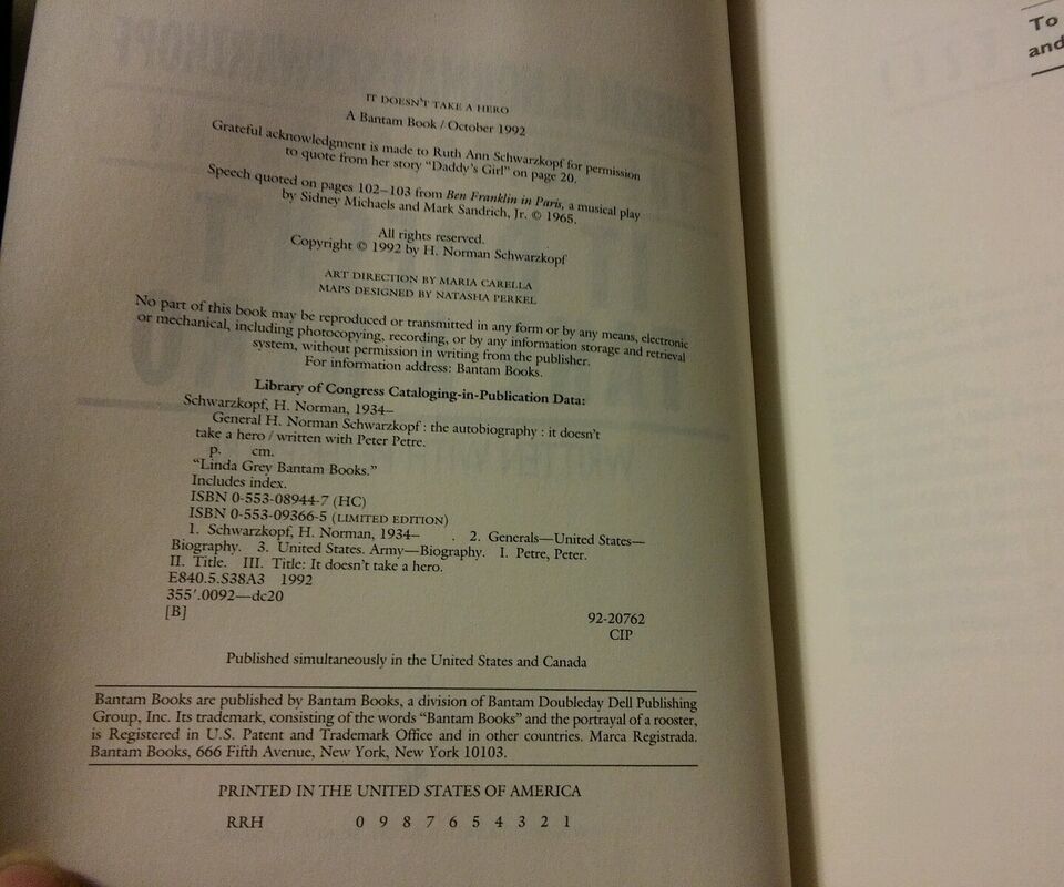 Here for you today is a nice condition book autobiography, Norman Schwarzkopf, It Doesn't Take a Hero. Minimal wear. See photos and ask any questions. I do my best to describe all items. Sometimes I miss things.. Please Please ask questions. Thanks for bidding and good luck. Check out all my items for some great finds. Lots of cool stuff at my sales. I can combine shipping on most.
