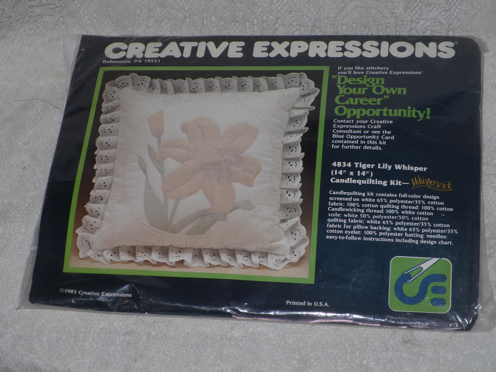 Full Color Design Screened on White Fabric, Cotton Quilting Thread, Cotton Candlewicking Thread, Quilting Fabric, Pillow Backing, Eyelet, Batting, Needle Instructions