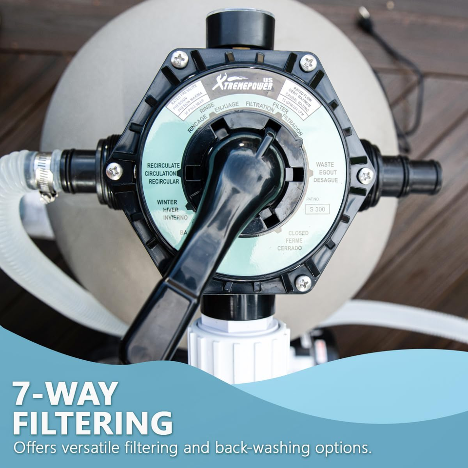 7-Way Multi-Port Filter - 7-Way multi port provides for easy use and quick back-washing; These pumps are capacitor start (These pumps are capacitor start and not for use/sale in California)