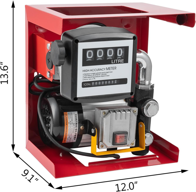 The Electric Diesel Fuel Pump is a versatile solution designed for efficiently pumping light oils like diesel or kerosene. It finds applications in various settings, including vehicles, construction sites, farms, and other fuel-powered equipment used outdoors. This pump is powered by an electric motor, equipped with a vane oil pump, flow meter, and computation meter. Its user-friendly design ensures convenience, reliability, ease of operation, and straightforward maintenance. The pump features an intuitive display that accurately shows the amount of fuel pumped per job, as well as a total lifetime service count for tracking usage. To reset the pumping count, a manual wheel is provided.