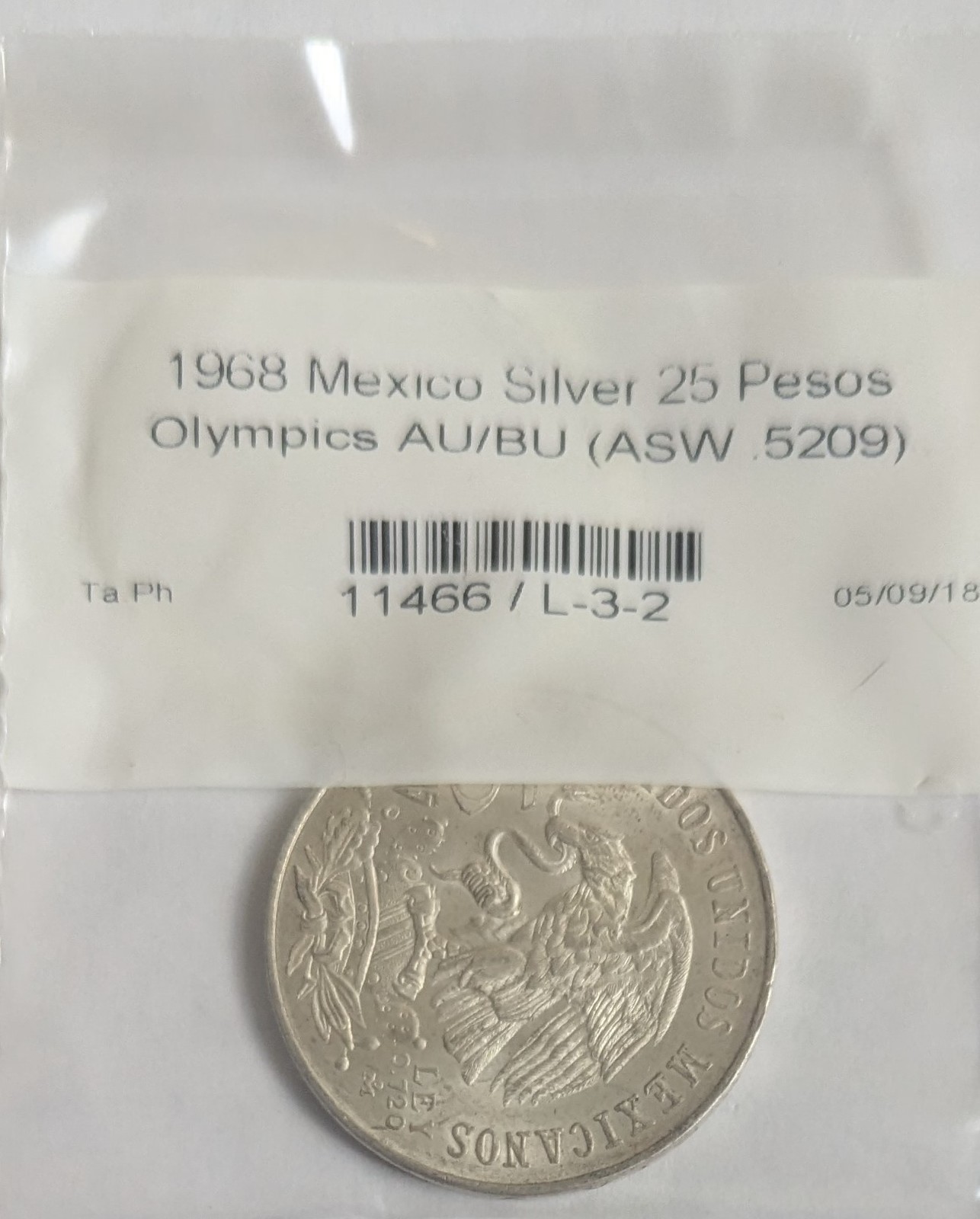 1968 Mexico Silver 25 Pesos Olympics AU/BU (ASW 5209) Coin
