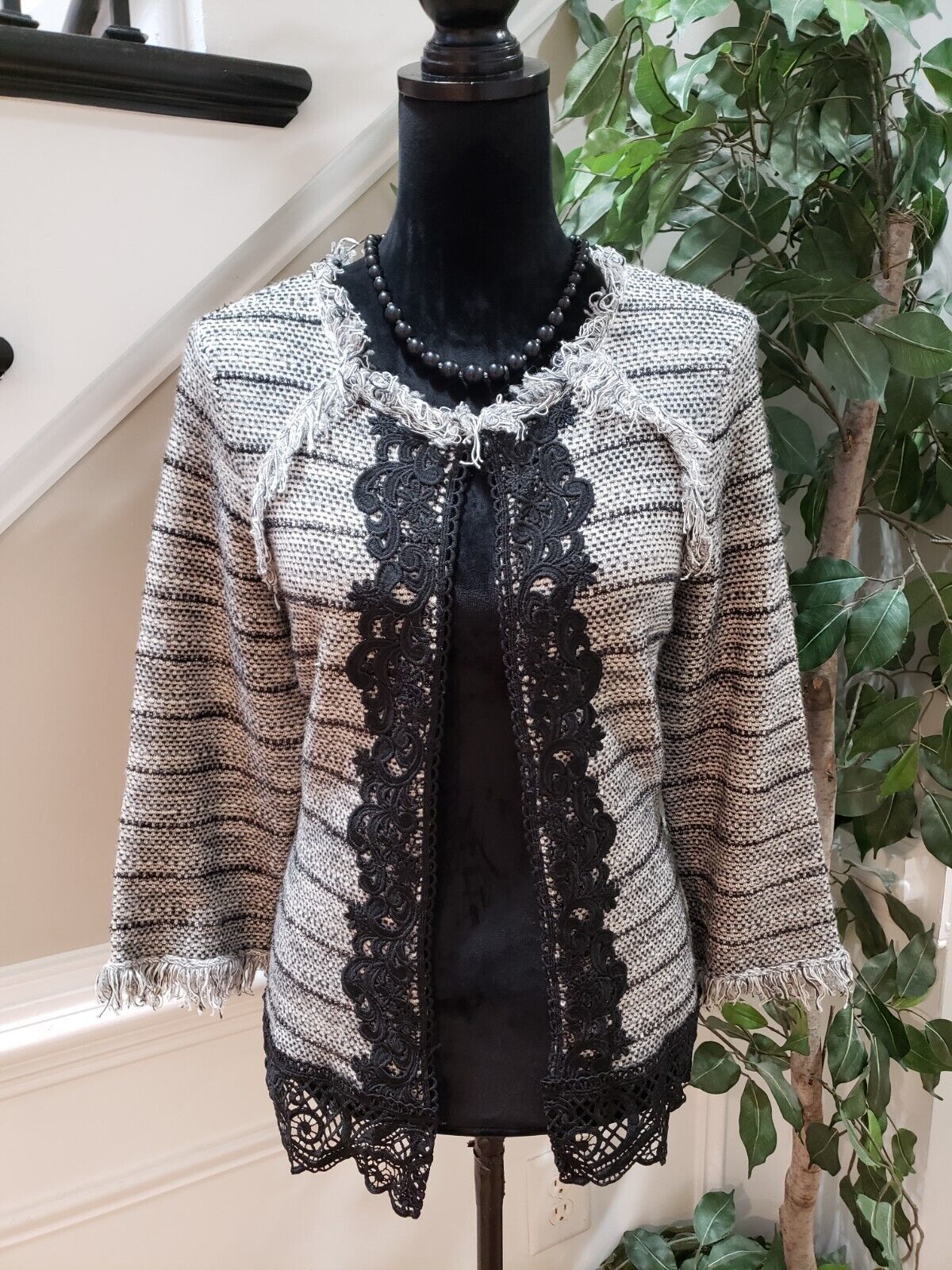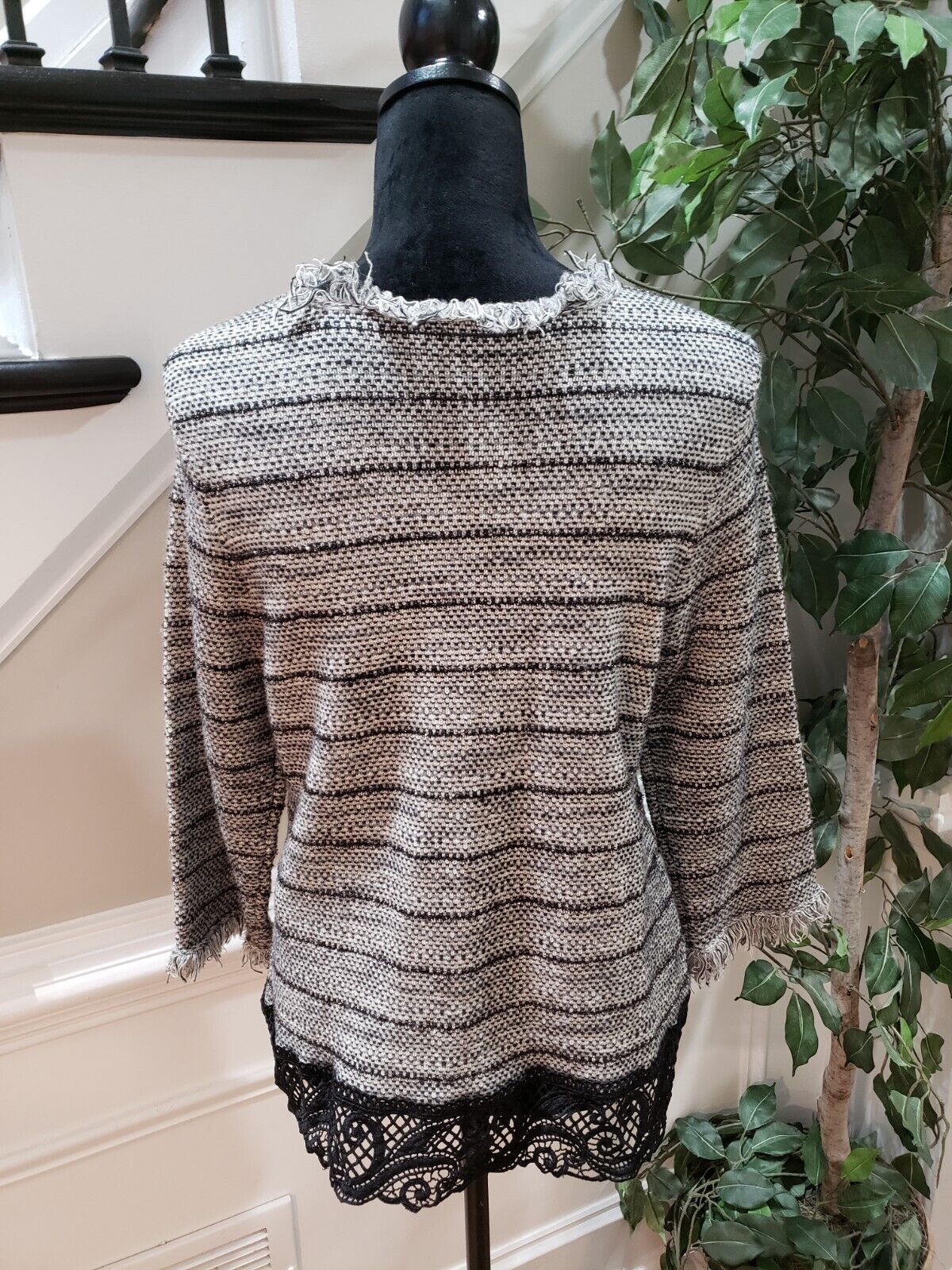 Chico's Womens Gray Striped Cotton Long Sleeve Round Neck Pullover Jacket Size M.