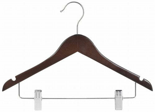 This hanger comes with a polished chrome swivel hook and notched shoulders for the option of hanging straps. Adjustable chrome finish pant/skirt clips have clear non-marking soft padded rubber cushions. These hangers are finished in dark walnut and double coated in clear lacquer to prevent splintering and for increased durability. This size hanger works well with older children between the approximate ages of 10 thru early teenage years.