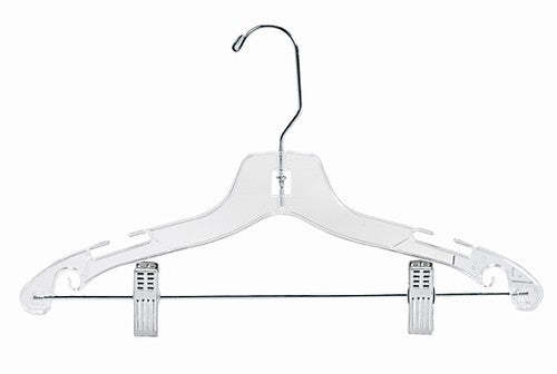 Introducing the Children's Clear Plastic Suit Hanger with Clips - the perfect addition to your closet organization! Whether you're in need of hangers for your trade shows, home use, or hotel, these hangers are sure to impress. Made of high-quality clear plastic, these hangers are durable and long-lasting, perfect for holding your child's clothing without taking up too much space in the closet. Measuring at a convenient 14 inches, these hangers are the ideal size for children's clothing, making them a must-have for any parent or guardian.Our clear plastic 14" children's suit hangers come with a swivel hook and a pair of notches in the shoulders designed for hanging straps. Sold in bundles of 25, half boxes of 50 or full boxes of 100 hangers.