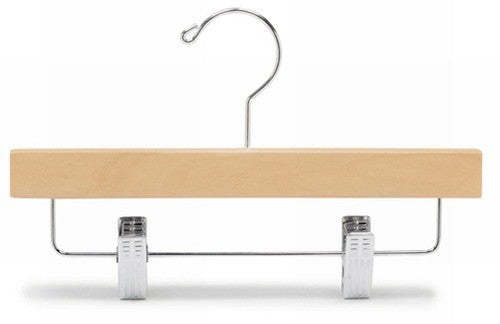 These 11" children's wooden pant/skirt hangers come with chrome swivel hooks and adjustable non-staining clips for hanging. Each polished chrome clip comes with clear soft rubber cushions to protect your child's pants and skirts from snags or tears. These wooden pant hangers are coated in multiple layers of clear varnish for durability and years of use.Perfect for trade shows, home use, or even in hotel rooms, this hanger is specifically designed to hang pants and skirts with ease. Measuring 11 inches in length, it is the ideal size for children's clothing. Made from high-quality wood, it features a natural finish that will complement any decor. Durable and sturdy, this hanger will withstand the weight of multiple clothing items without bending or breaking. Keep your child's closet clutter-free and their outfits looking neat and crisp with the Children's Wooden Pant/Skirt Hanger. Order yours today and enjoy the convenience and organization it brings to your child's wardrobe.