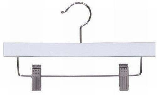 These 10" children's wooden pant/skirt hangers come with chrome hardware, adjustable chrome clips for hanging and are coated in a durable white satin finish.But that's not all. The White 10" Children's Wood Skirt/Pant Hanger comes in a pack of 25, 50, or 100, giving you the option to choose the quantity that best suits your needs. Whether you have a large family, run a busy hotel, or simply want to stock up on hangers, we've got you covered.