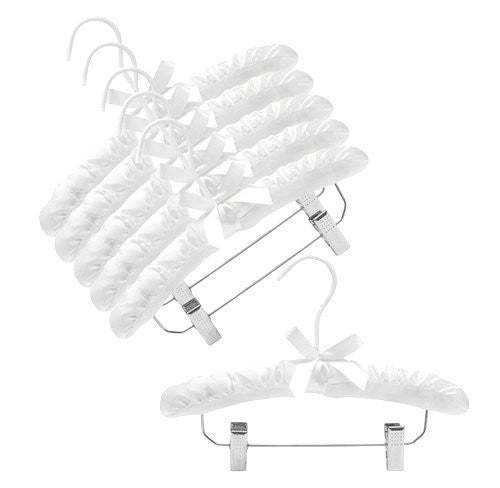 These 12" soft satin padded hangers are just the right size for children's clothes. The plush padding and vinyl covered hook also helps to prevent hanger marks and protects clothes from snags and tears. Chrome clips with non-marking vinyl cushions are great for hanging pants or skirts and also keeping matching outfits together. With our 12" Satin Children's Hangers with Clips, you can finally say goodbye to messy and cluttered closets. These hangers will not only keep your child's clothing organized, but also showcase them in a neat and beautiful way. Order now and give your child's clothing the care and organization it deserves. Sold in Packs of (6) hangers.