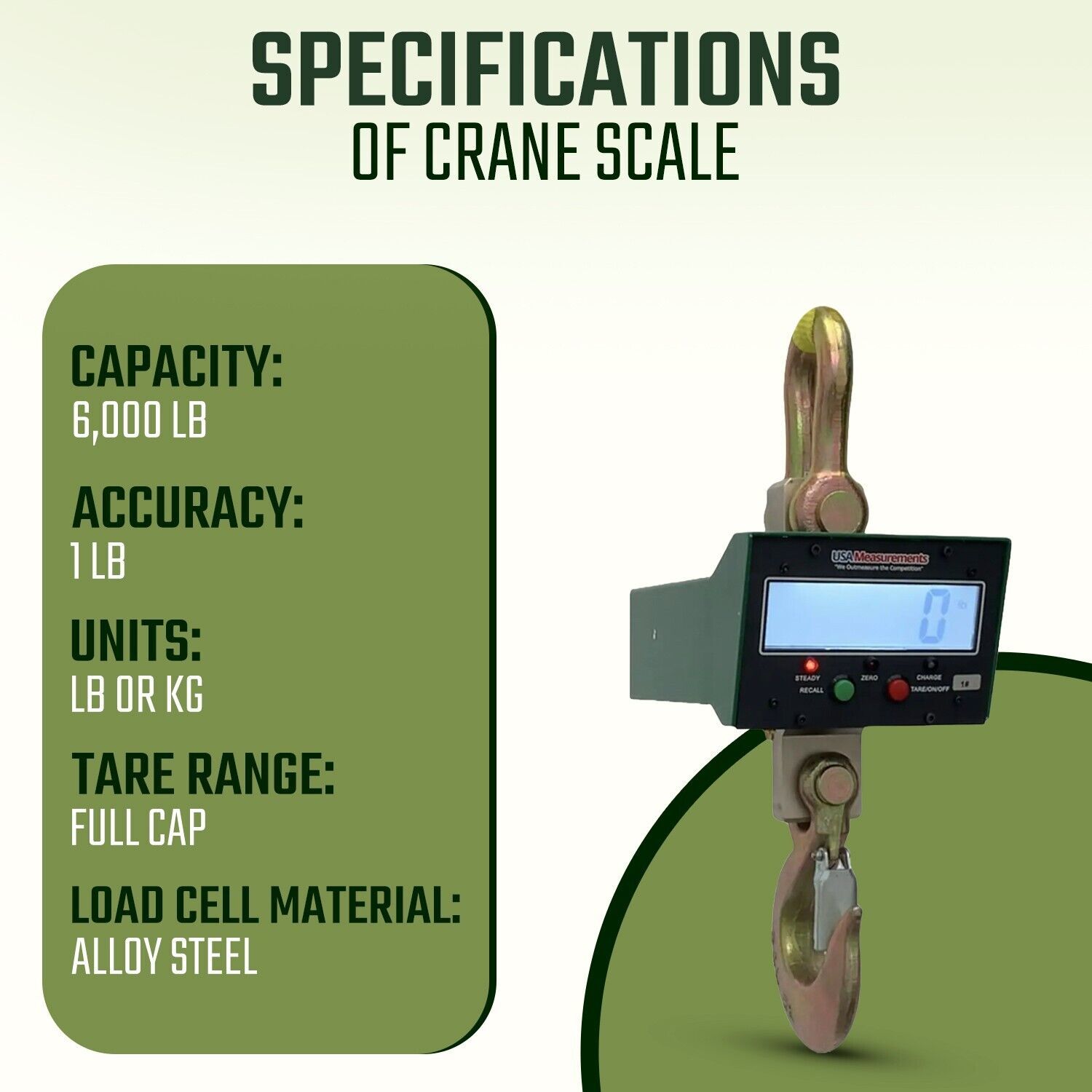 Crane Scale Best Heavy-Lifting Option The US-LCW6K Crane Scale is the ultimate heavy-lifting option! With its robust 6,000 kg capacity and precise 1 lb accuracy, this hanging crane scale ensures consistent, reliable measurements. Whether you need readings in pounds or kilograms, this digital crane scale delivers with ease. Its durable construction and user-friendly design make it perfect for both personal and commercial use, ensuring long-lasting performance and simplicity of operation. Heavy-Duty Capacity Crane Scale Crafted with high-quality materials and precise calibration, the professional crane scale ensures consistent, accurate results. Its handheld display and straightforward unit switching simplify operation, making it user-friendly. This heavy duty hanging scale is ideal for a wide range of applications, from industrial use to personal projects, offering versatility in your toolkit. With a high capacity of up to 6,000 lb, it is perfect for heavy-duty tasks. Specifications: middot; Capacity: 6,000 lb middot; Accuracy: 1 lb middot; Calibrated in Pounds middot; Tare rage: full cap. middot; Load Cell Material: alloy steel middot; Calibrated for accuracy middot; AC/DC adapter (included) middot; Built-in rechargeable battery middot; 2 Year Warranty on Frame middot; 2 Year Warranty on Electronics middot; Non-NTEP (Not legal for trade) middot; US-LCW6K Brochure What rsquo;s Included: middot; 1 Top Shackle middot; 1 Bottom Clevis Hook middot; 1 Tension Load cell middot; 1 Built-in Rechargeable Battery middot; 1 LCD Bright Digital Display middot; 1 Wireless US-WFX Remote middot; 1 Wireless Small Remote middot; 1 AC Adapter middot; 1 Manual Care Instructions: middot; Wipe the scale with a dry cloth. middot; Avoid exposing the scale to extreme temperatures, moisture, or direct sunlight. middot; Recharge the built-in battery regularly to ensure optimal performance. middot; Use the provided AC/DC adapter for charging. HEAVY DUTY CRANE SCALE: Our Crane Scale is designed for heavy-duty tasks, with a robust capacity of up to 6,000 lb and precise 1 lb accuracy. Whether you're using it for personal or commercial purposes, this industrial crane scale ensures consistent, dependable measurements in both pounds and kilograms. HIGH-QUALITY MATERIALS: Built with high-quality materials, including a strong alloy steel load cell, this hanging scale is designed to withstand rigorous use and provide long-lasting performance. Its portable scale precise calibration ensures consistent, accurate results every time, making it a reliable tool for your heavy-lifting needs. VERSATILE amp; USER-FRIENDLY DESIGN: This hanging digital scale is ideal for a wide range of applications, from industrial use to personal projects. The scale hanging US-WFX Handheld Display provides a clear, easy-to-read interface, and the simple unit switching between LB and KG makes the operation straightforward and user-friendly. CONVENIENT POWER OPTIONS amp; TARE FUNCTION: The digital hanging scale comes with an AC/DC adapter and a built-in rechargeable battery, ensuring you always have power when needed. The hanging weight scale full capacity tare function allows you to reset the scale to zero even when measuring bulky items, enhancing its usability and convenience. RELIABLE amp; WARRANTY: Backed by a 2-year warranty on both the frame and electronics, the hook scale gives you peace of mind and confidence in your purchase. Its hanging scales digital weight precise calibration and reliable construction ensure consistent, accurate results for years to come.