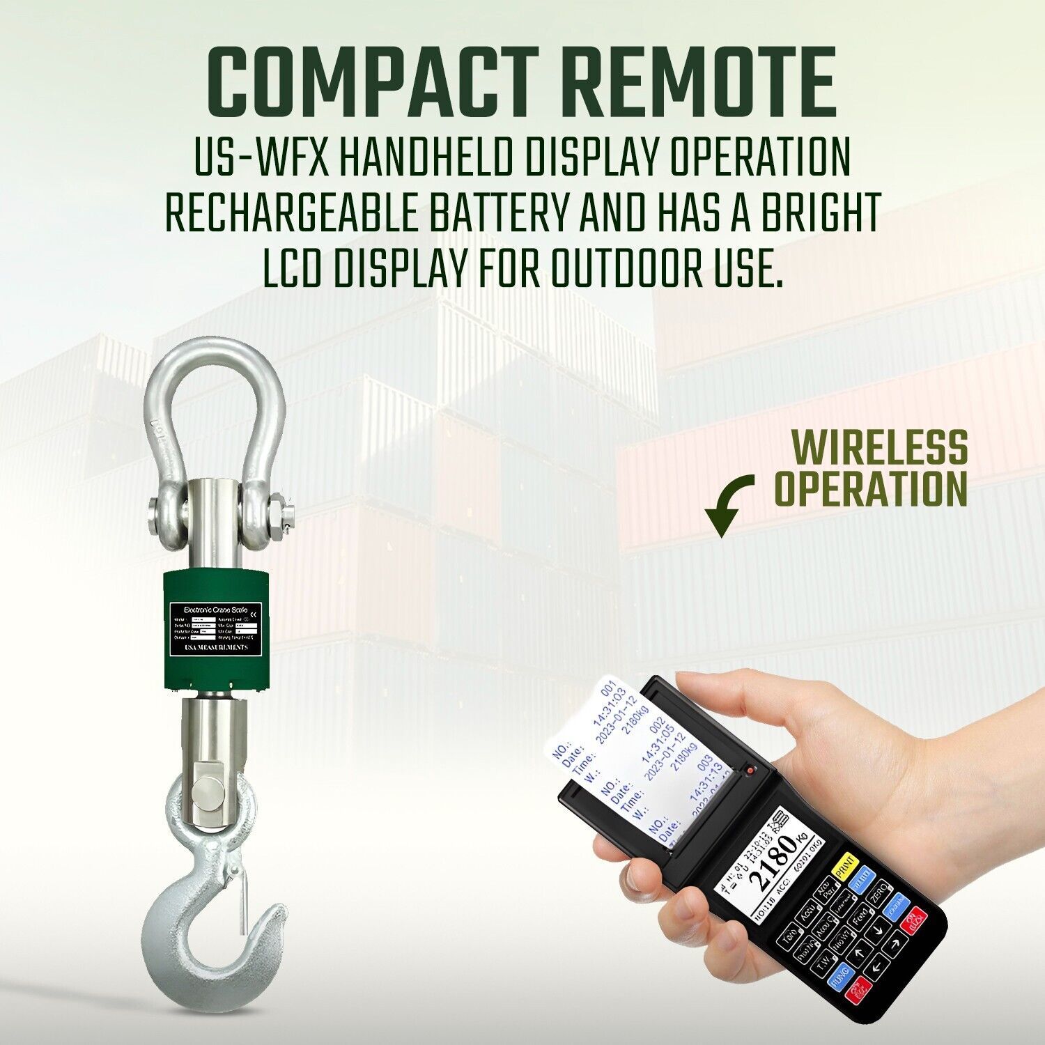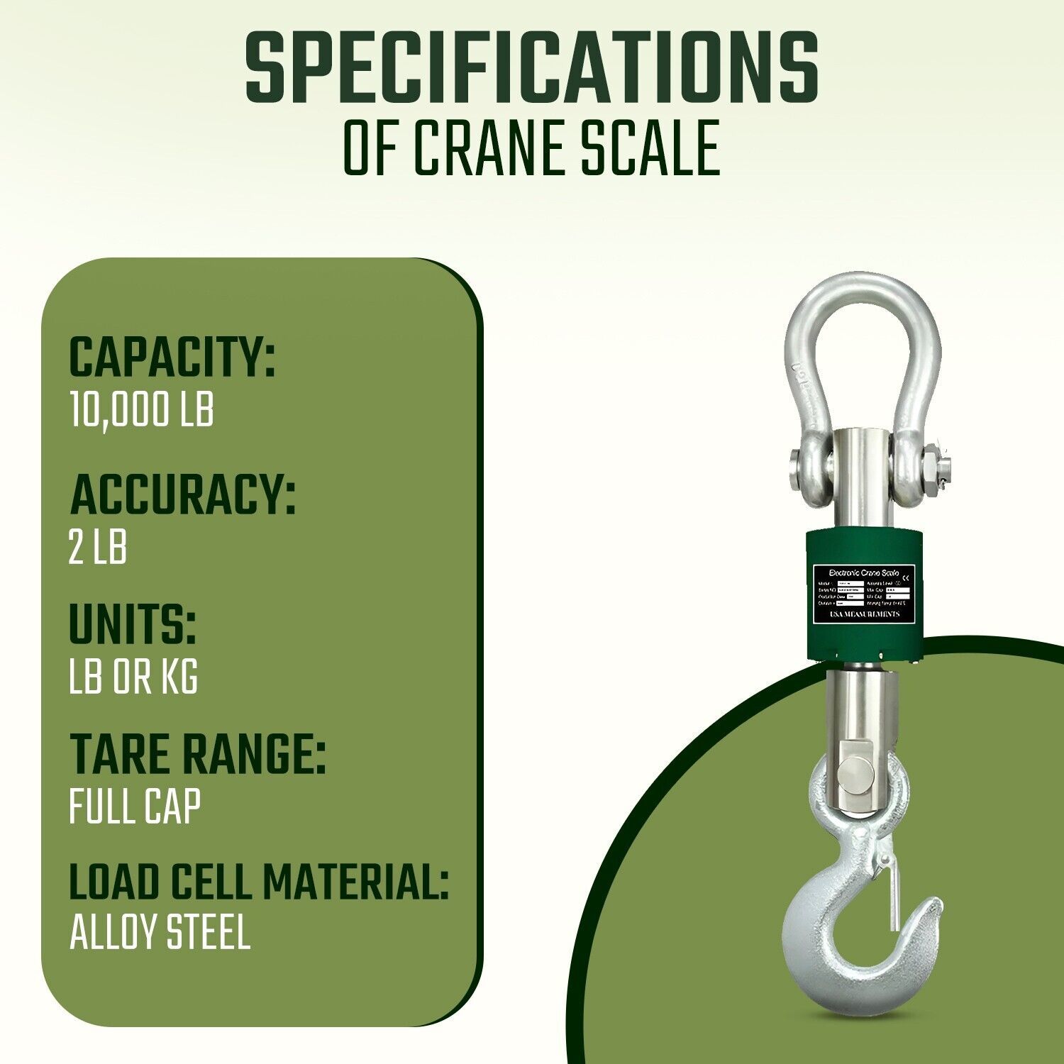 Crane Scale Best Heavy-Lifting Option The US-LCW10K Crane Scale is the ultimate heavy-lifting option! With its robust 10,000 kg capacity and precise 2 lb accuracy, this hanging crane scale ensures consistent, reliable measurements. Whether you need readings in pounds or kilograms, this digital crane scale delivers with ease. Its durable construction and user-friendly design make it perfect for both personal and commercial use, ensuring long-lasting performance and simplicity of operation. Heavy-Duty Capacity Crane Scale Crafted with high-quality materials and precise calibration, the professional crane scale ensures consistent, accurate results. Its handheld display and straightforward unit switching simplify operation, making it user-friendly. This heavy duty hanging scale is ideal for a wide range of applications, from industrial use to personal projects, offering versatility in your toolkit. With a high capacity of up to 10,000 lb, it is perfect for heavy-duty tasks. Specifications: middot; Capacity: 10,000 lb middot; Accuracy: 2 lb middot; Units: LB or KG middot; US-WFX Handheld Display middot; Built in Receipt printer middot; Calibrated in Pounds middot; Tare rage: full cap. middot; Load Cell Material: alloy steel middot; Calibrated for accuracy middot; AC/DC adapter (included) middot; Built-in rechargeable battery middot; 2 Year Warranty on Frame middot; 2 Year Warranty on Electronics middot; Non-NTEP (Not legal for trade) Care Instructions: Wipe the scale with a dry cloth. Avoid exposing the scale to extreme temperatures, moisture, or direct sunlight. Recharge the built-in battery regularly to ensure optimal performance. Use the provided AC/DC adapter for charging. BULLETS HEAVY DUTY CRANE SCALE: Our Crane Scale is designed for heavy-duty tasks, with a robust capacity of up to 10,000 lb and precise 2 lb accuracy. Whether you're using it for personal or commercial purposes, this industrial crane scale ensures consistent, dependable measurements in both pounds and kilograms. HIGH-QUALITY MATERIALS: Built with high-quality materials, including a strong alloy steel load cell, this hanging scale is designed to withstand rigorous use and provide long-lasting performance. Its portable scale precise calibration ensures consistent, accurate results every time, making it a reliable tool for your heavy-lifting needs. VERSATILE amp; USER-FRIENDLY DESIGN: This hanging digital scale is ideal for a wide range of applications, from industrial use to personal projects. The scale hanging US-WFX Handheld Display provides a clear, easy-to-read interface, and the simple unit switching between LB and KG makes the operation straightforward and user-friendly. CONVENIENT POWER OPTIONS amp; TARE FUNCTION: The digital hanging scale comes with an AC/DC adapter and a built-in rechargeable battery, ensuring you always have power when needed. The hanging weight scale full capacity tare function allows you to reset the scale to zero even when measuring bulky items, enhancing its usability and convenience. RELIABLE amp; WARRANTY: Backed by a 2-year warranty on both the frame and electronics, the hook scale gives you peace of mind and confidence in your purchase. Its hanging scales digital weight precise calibration and reliable construction ensure consistent, accurate results for years to come.