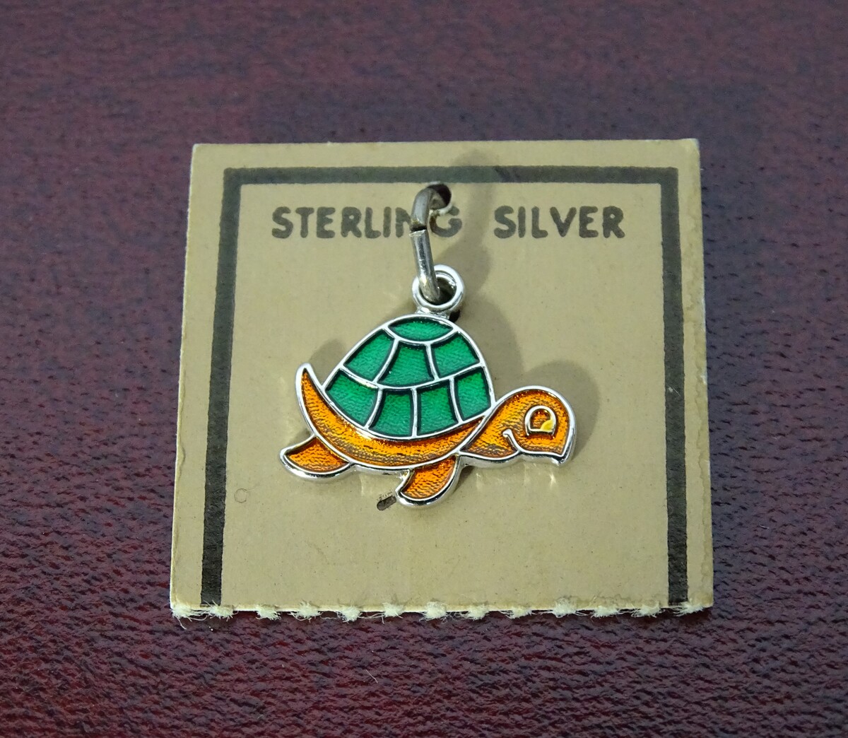 1970s vintage adorable enamel turtle charm made of sterling silver. Orange and green enamel with sterling dividing lines to add texture to the piece. Intended for a bracelet but one could hang it as a pendant on a necklace. Never used, still on original card. This was my mothers - ONE OWNER. Nicely made.