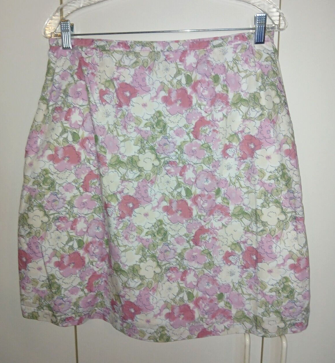 THIS IS A NICE L.L. BEAN FAVORITE FIT LADIES 100% COTTON/LINED PINK/WHITE FLORAL KNEE-LENGTH SKIRT IN A SIZE 8 REGULAR. THE ONLY DEFECT IS A SMALL GREEN DOT ON THE INNER BRAND-NAME TAG.