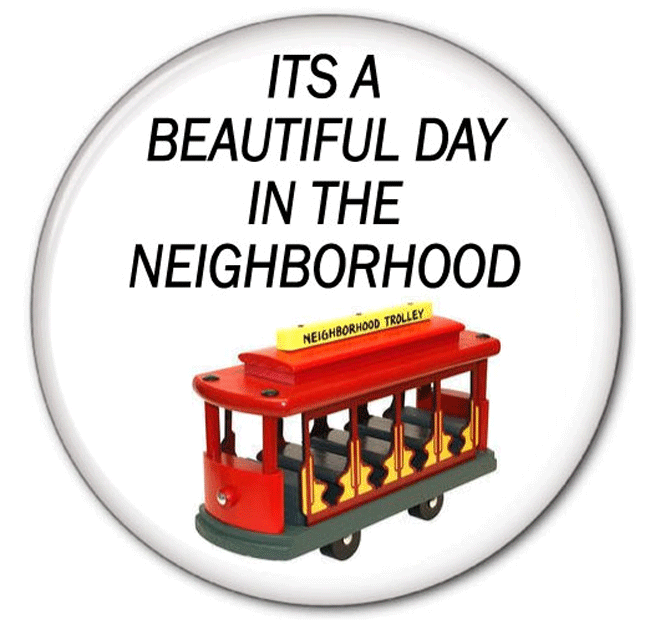 MR ROGERS NAME BADGE PROP HALLOWEEN COSPLAY MAGNET BACK AND 3" BUTTON W/ TROLLIE