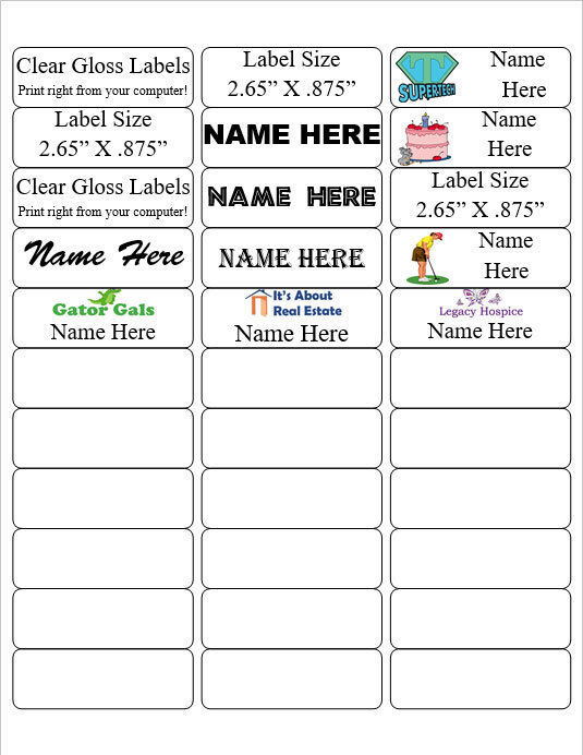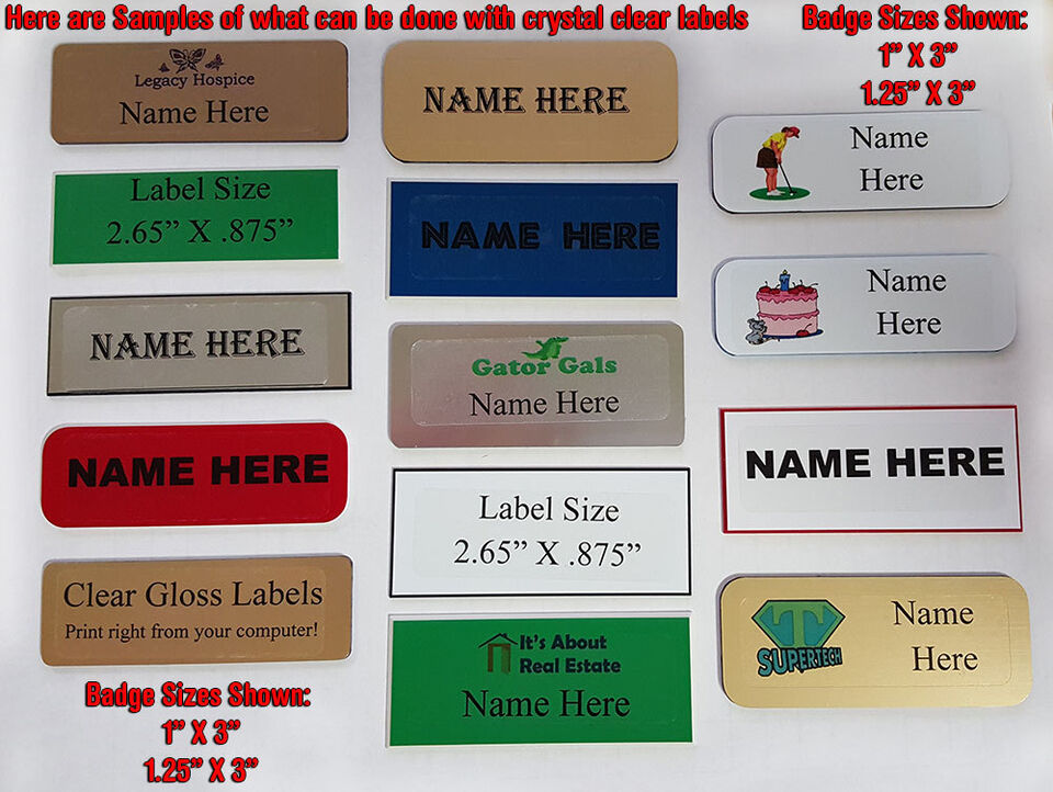 THESE BADGES ARE BLANK SO YOU CAN PERSONALIZE THEM WITH THE CRYSTAL CLEAR LABELS THAT ARE INCLUDED IN YOUR KIT. YOU WILL RECEIVE BOTH INKJET LASER CRYSTAL CLEAR LABELS AND EASY TO FOLLOW INSTRUCTIONS ON HOW TO PERSONALIZE YOUR BADGES WITH A CUSTOM LOOK. There is also a link to our instructional video. Our clear gloss labels for LASER OR INKJET Printing are a transparent polyester material with permanent adhesive. The material has excellent resistance to water and is very durable. The material is 1/16" thick. The labels measure 2.625" x 0.87" and come 33 per sheet.