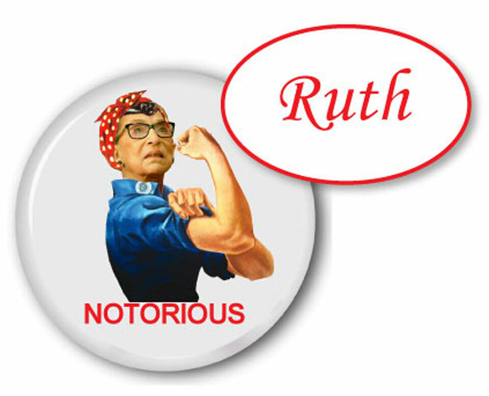 RUTH BADER GINSBURG AS ROSIE RIVETER RUTH OVAL NAME BADGE & NOTORIOUS 3" BUTTON