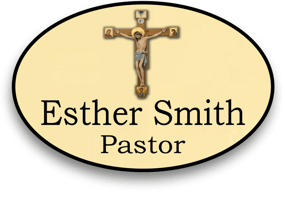 This listing is for a name badge tag THAT YOU CAN CUSTOMIZE WITH YOUR NAME AND TITLE (WE CAN ALSO ADD YOUR CHURCH'S NAME IF YOU WOULD LIKE). THE BADGE HAS ARTWORK OF A CROSS AND BLACK LETTERING. Your badge will arrive with a MAGNETIC FASTENER on the back. This badge is an GOLD OVAL BACKGROUND WITH BLACK BEVELED EDGE AND MEASURES APPROX. 2" x 3". SIMPLY SEND US A MESSAGE OR LEAVE A MESSAGE IN THE NOTE SECTION OF YOUR PAYMENT WITH YOUR PERSONALIZATION INFORMATION. This badge is printed in full color with a clear overlay that protects the print for a durable long lasting badge. Your badge will ship 2 DAYS, FREE US ONLY. No hidden charges or set up fees. We also carry a premium econo BLANK name badge line for businesses with high turn over employees (these badges can be personalized with crystal clear labels.)
